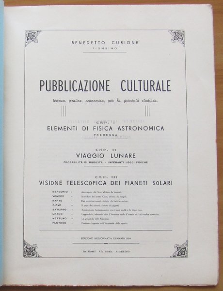 FISICA CELESTE - VIAGGIO LUNARE - VISIONI PLANETARIE COLLANA PUBBLICAZIONE CULTURALE PER LA GIOVENTU' STUDIOSA PIOMBINO TIP. ROSSI 1954