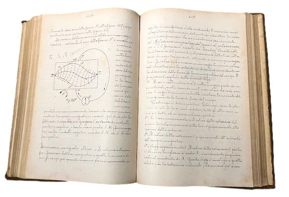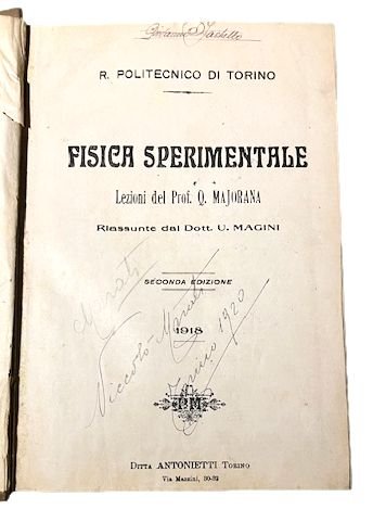 In 4°; 672 pp. Legatura coeva in piena tela marrone con autore, titolo e filetti inoro al dorso. Antica firma di possesso privato al frontespizio. Alcune sottolineature a matita coeve e qualche appunto al margine esterno bianco. Seconda rarissima edizione di questopera che raccoglie le lezioni del celeberrimo fisico siciliano, Quirino Francesco Valentino Majorana (Catania, 28 ottobre 1871 Rieti, 31 luglio 1957). Quirino Francesco Valentino Majorana è stato un fisico italiano di spicco, noto per il suo contributo alla fisica teorica e per la sua eredità scientifica. Proveniente da una famiglia di intellettuali, Quirino ha sviluppato fin da giovane una profonda passione per le scienze fisiche. Dopo aver conseguito la laurea in fisica allUniversità di Catania, intraprese una carriera accademica che lo portò a una crescente notorietà nel campo della fisica nucleare. Quirino è stato un fervente sostenitore delle teorie quantistiche e della meccanica ondulatoria, anticipando alcune discussioni che sarebbero diventate centrali nello sviluppo dellafisica nel XX secolo. I suoi interessi sperimentale furono molto ampi andando dalle telecomunicazioni allenergia gravitazionale, dalle birifrangenza magnetica allelettrostatica, fino alla magneto-ottica e poi, come detto alle teorie quantistiche. Quirino fu una figura fondamentale per suo nipote Ettore Majorana, nato nel 1906, che divenne uno dei fisici più brillanti della sua generazione. Quirino e Ettore condivisero un forte legame, sia familiare che intellettuale. Quirino influenzò profondamente Ettore, trasmettendogli passioni e conoscenze scientifiche, che avrebbero contribuito a formare il pensiero di Ettore sulla meccanica quantistica. Ettore, noto per i suoi studi innovativi su particelle elementari e per la misteriosa scomparsa nel 1938, trovò in Quirino una figura di riferimento e un mentore. La passione di Quirino per la fisica e la sua autorità accademica furono di fondamentale importanza per guidare il giovane Ettore nei primi anni della sua ricerca scientifica. Dopo la Seconda Guerra Mondiale, Quirino si ritirò dalla vita accademica, continuando a riflettere sul significato della scienza e sul suo impatto sulla società. Morì il 31 luglio 1957 a Rieti, lasciando uneredità duratura nel panorama della fisica italiana e un ricordo indelebile del legame tra zio e nipote, che ha profondamente influenzato il corso della fisica moderna. Rarissima opera di notevole importanza per la storia della fisica sperimentale italiana. Lopera qui presentata in capitoli raccoglie esperienze e studi di meccanica, Propagazione del moto vibratorio armonico, Fisica molecolare, Energia Raggiante, Energia Elettrica, Campo magnetico costante, Campo magnetico variabile e diverse parti relative agli elettroni. Rarissima trascrizione delle lezioni di fisica sperimentale di Quirino Majorana.