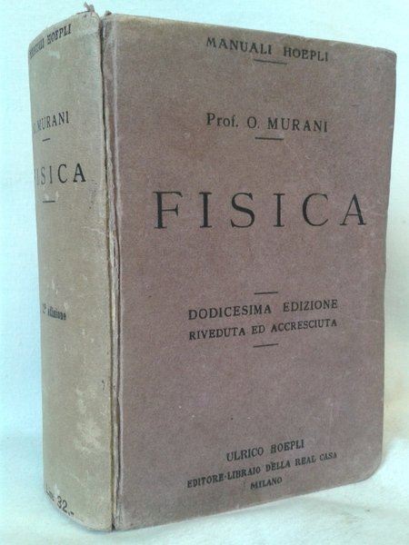 Volume in 12 brossura editoriale cartonata, titolo al piatto ed al dorso, frontespizio stampato a due colori, prefazione, indice, XXVIII, 1198 pp., 653 illustrazioni intercalate nt. Semplice e chiaro manuale di fisica, illustra la gravitazione universale, l'idrostatica, l'aerostatica, l'acustica, l'energia termica, le macchine a vapore; la fotometria, gli strumenti ottici, la diffrazione e polarizzazione della luce, l'eletrostatica, le macchine e condensatori elettrici, la corrente, il magnetismo, la telegrafia, la legge di Ohm e le sue applicazioni; i fenomeni chimici della corrente, l'energia termica, le macchine dinamoelettriche, la telegrafia e telefonia senza fili, i raggi catodici, x, la radiattivit e l'elettricit atmosferica. Arricchito da esaustive incisioni dei fenomeni e macchinari. Lieve bruniture e rare fioriture della carta, dorso in parte staccato della legatura. Utile ed interessante, di facile consultazione.