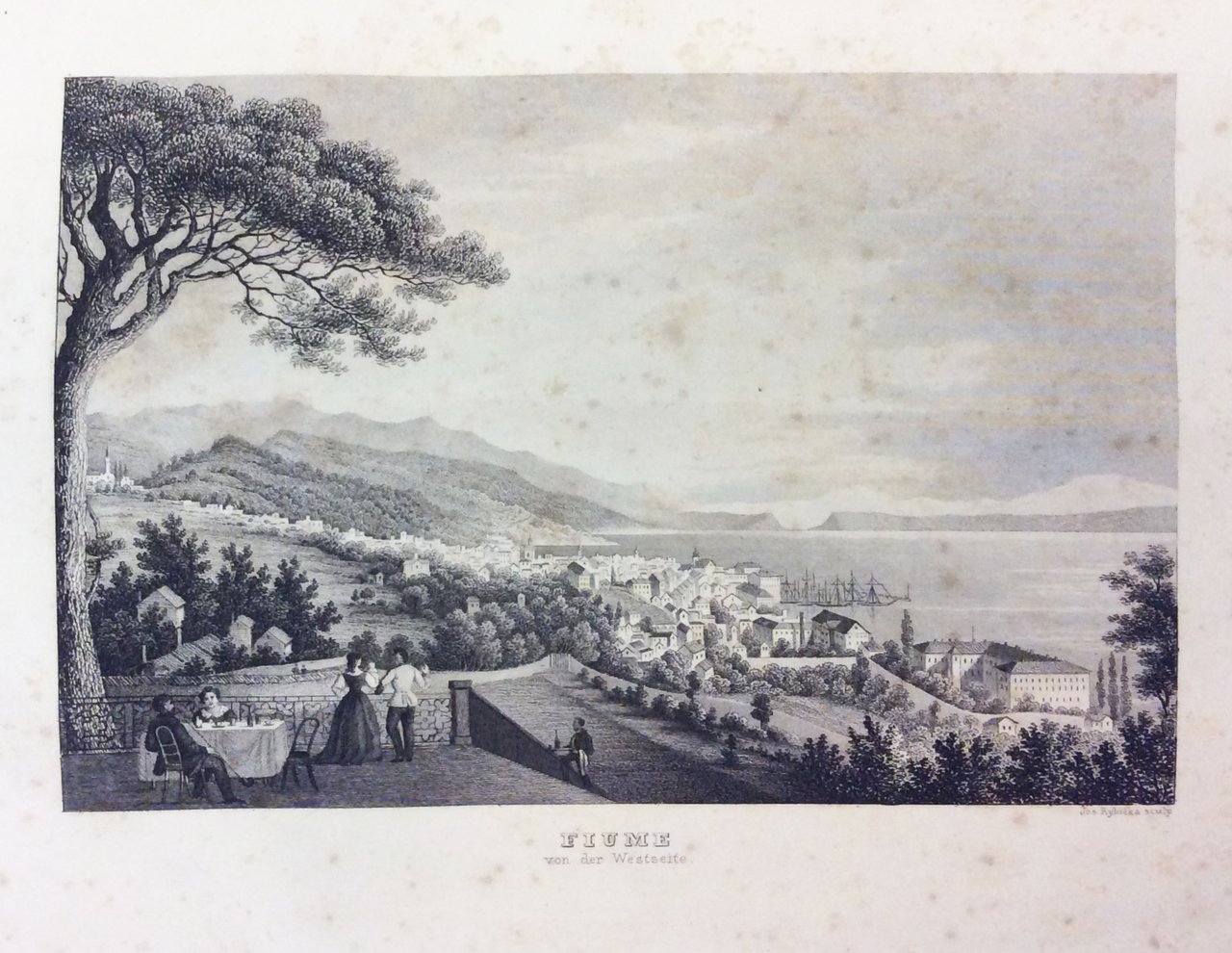 In-8 gr. (mm. 242x162), cartonato muto con copertina orig. applicata al piatto anter., pp. 44, illustrato fuori testo da: una bella veduta di Fiume all'antiporta inc. su acciaio, una grande carta geografica (più volte ripieg.) della parte settentrionale del Mare Adriatico (a colori) e una pianta della città e del porto di Fiume (in bianco e nero). Interessante saggio su questa città marittima, sull'attività dei cantieri di Fiume, Buccari e Portorè, sulla sua favorevole posizione nell'Adriatico ecc., scritto dal Capitano di corvetta Heinrich von Littrow.Solo la veduta con fiorit. margin., altrimenti esemplare ben conservato.