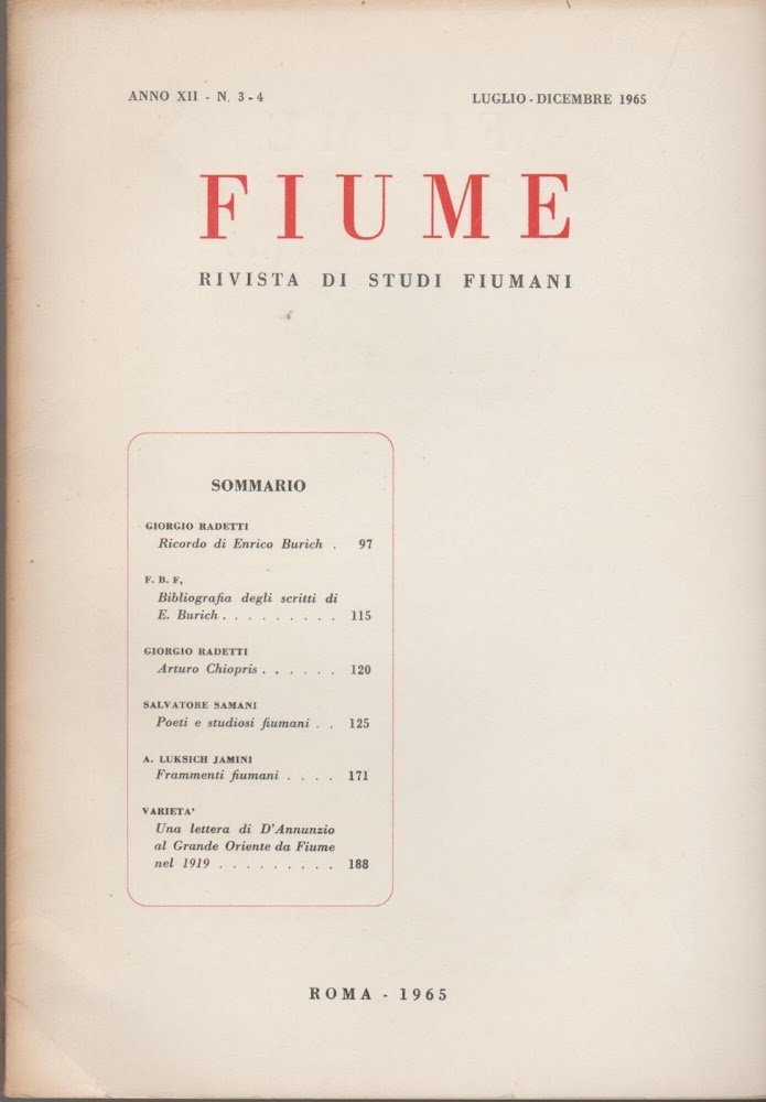FIUME Rivista di studi fioumani Anno XII n.1-2-3-4 1965