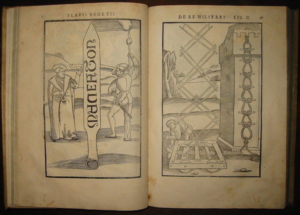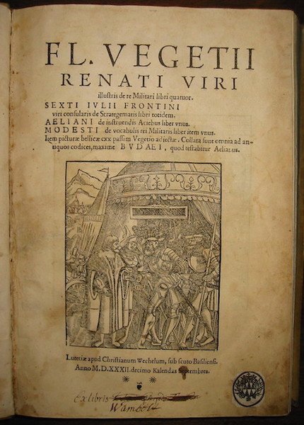 Fl. Vegetii Renati viri illustris De re Militari libri quatuor. Sexti Iulii Frontini viri consularis De strategematis libri totidem. Aeliani De instruendis Aciebus liber unus. Modesti De vocabulis rei Militaris liber item unus. Item picturae bellicae CXX passim Vegetio adiectae. Collata sunt omnia ad antiquos codices, maxime Budaei, quod testatibur Aelianus