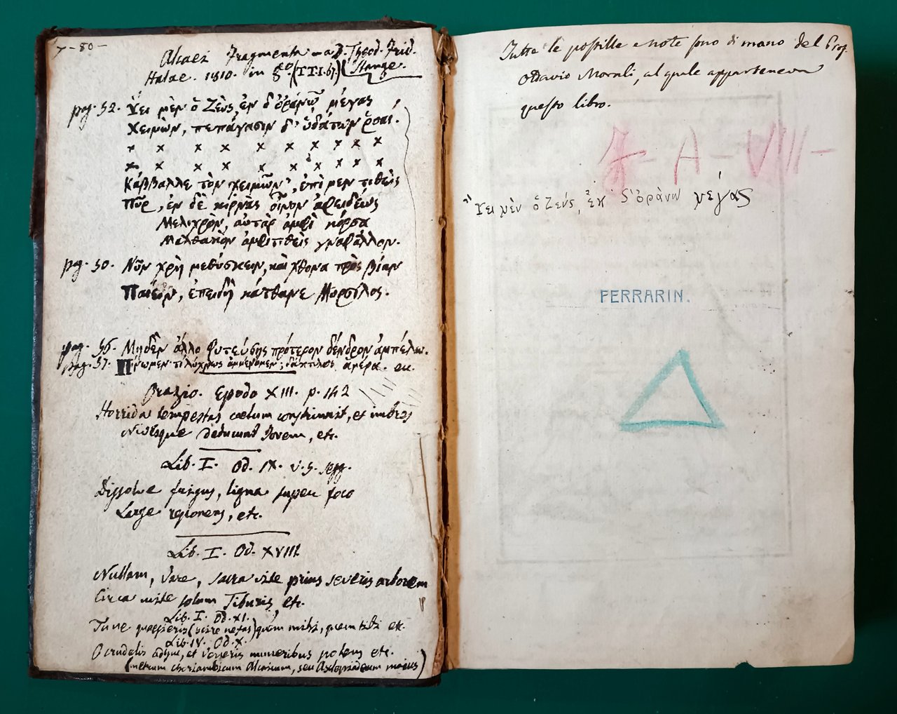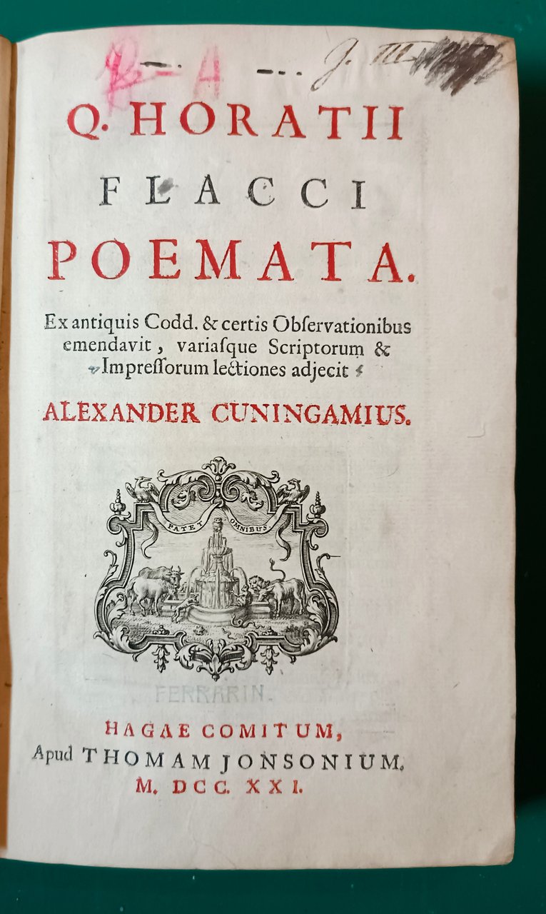 Flacco Quinto Orazio - Q HORATII FLACCI POEMATA. Ex antiquis codd. et certis observationibus emendavit, variaque scriptorum & impressorum lectiones adjecit Alexander Cuningamius. Hagae Comitum, apud Thomam Jonsonium. 1721. Cm 18. Legatura in pelle con nervature e decori in oro al dorso, mancanze e tracce di usura. Cinque carte con antiporta, frontespizio figurato e introduzione al lettore, 309, 1 carta bianca. Il testo e le carte bianche sono arricchite da numerose note a penna in latino e greco di pugno del prof. Ottavio Morali (Bonate Superiore 1763 – Milano 1826), letterato, politico riformatore, traduttore di classici che ha ricoperto numerosi ruoli pubblici nel campo delle pubblica istruzione. Responsabile dell'istituzione delle prime Biblioteche Civiche a seguito delle confische napoleoniche.