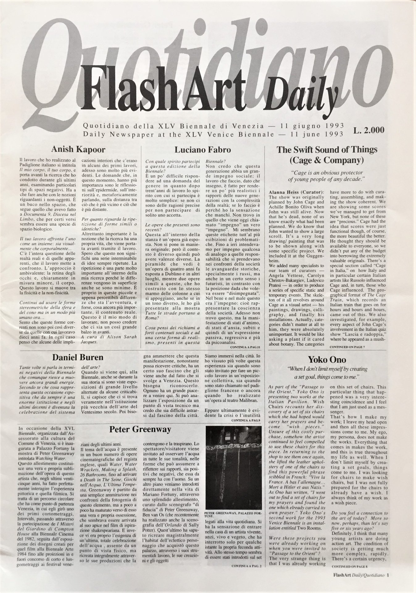 Flash Art Daily. Quotidiano della XLV Biennale di Venezia. 11 giugno 1993