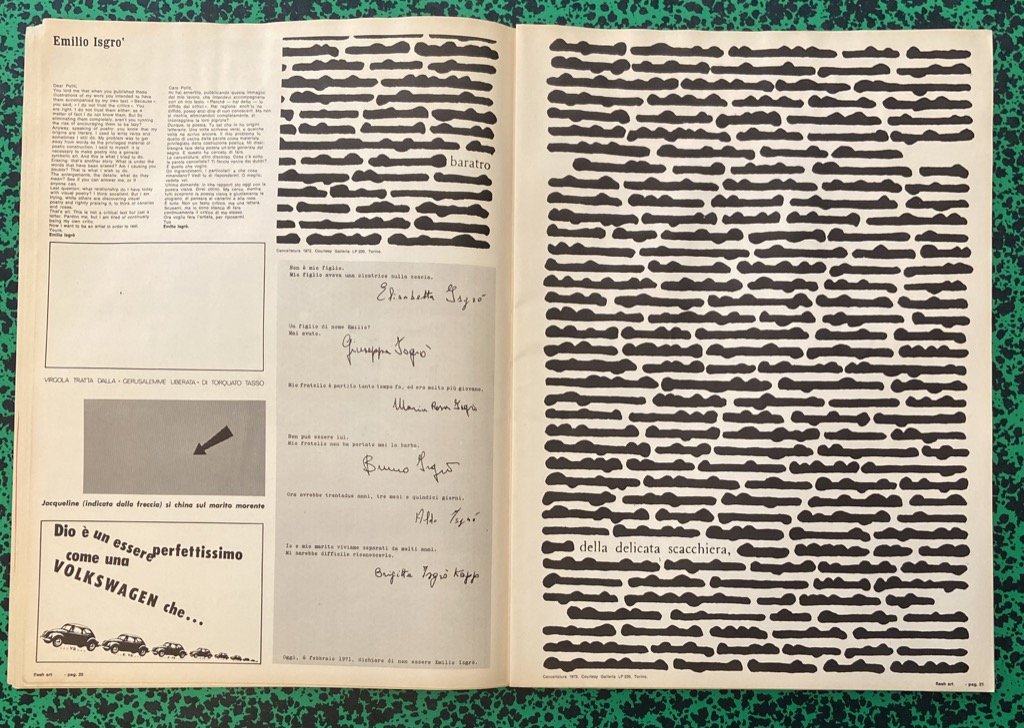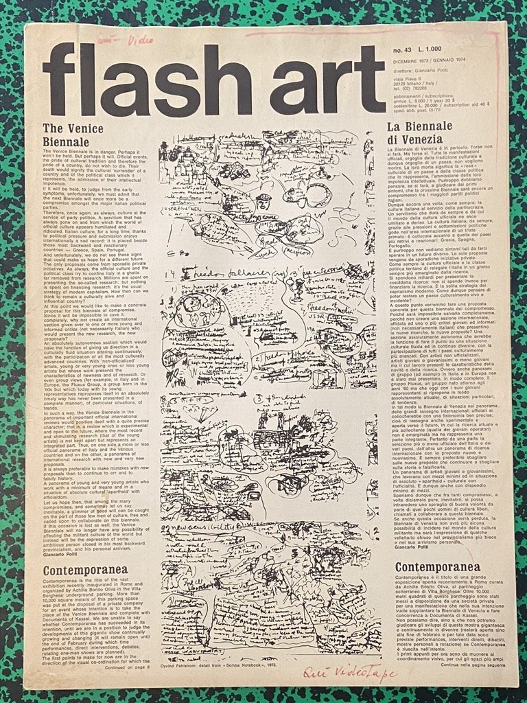 Numero della rivista, cm 42 x 32, pp 48 illustrate in nero, a fogli sciolti. Esemplare da studio. Varie sottolineature, segni e note a penna e pennarello, macchiette, strappo sul piatto posteriore. Fascicolo dell'importante rivista fondata da Giancarlo Politi nel 1967, versione bilingue italiano e inglese. In questo numero: La Biennale di Venezia (Politi), Record as Artwork (Celant), video arte (Rosetta Brooks), Nicole Gravier, Paul Arman Gette, Oyvind Fahlstrom, robert Mangold, Sirio Bellucci, Robyn Denny, Emilio Isgrò, Peter Hutchinson, Penck, Maurizio Nannucci, Dario Villalba, Poesia Visiva 1972-1973 (Rossana Apicella), Getulio Alviani.