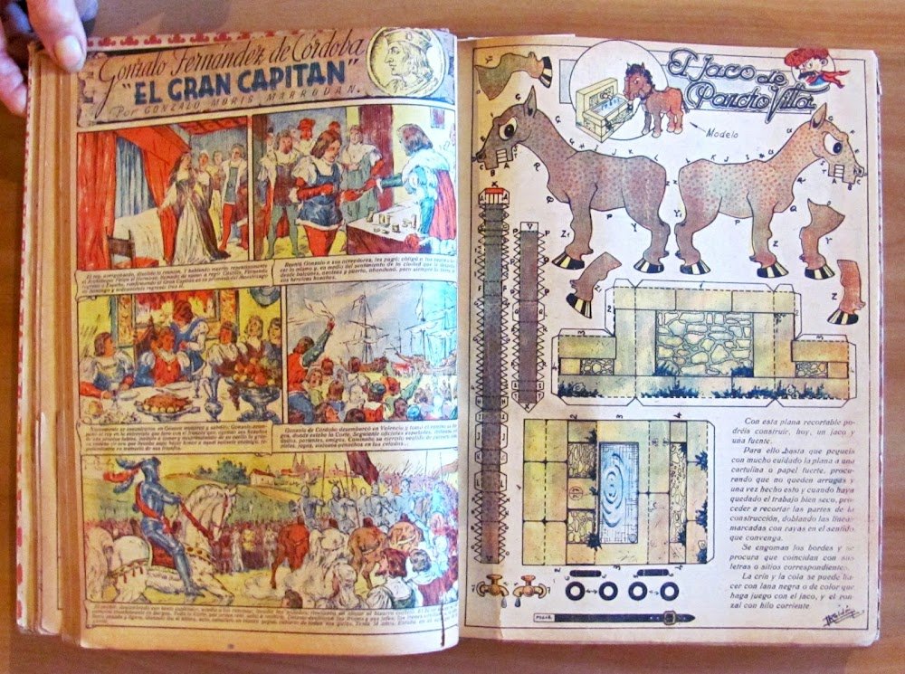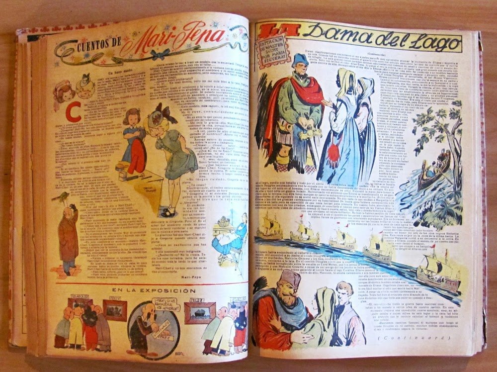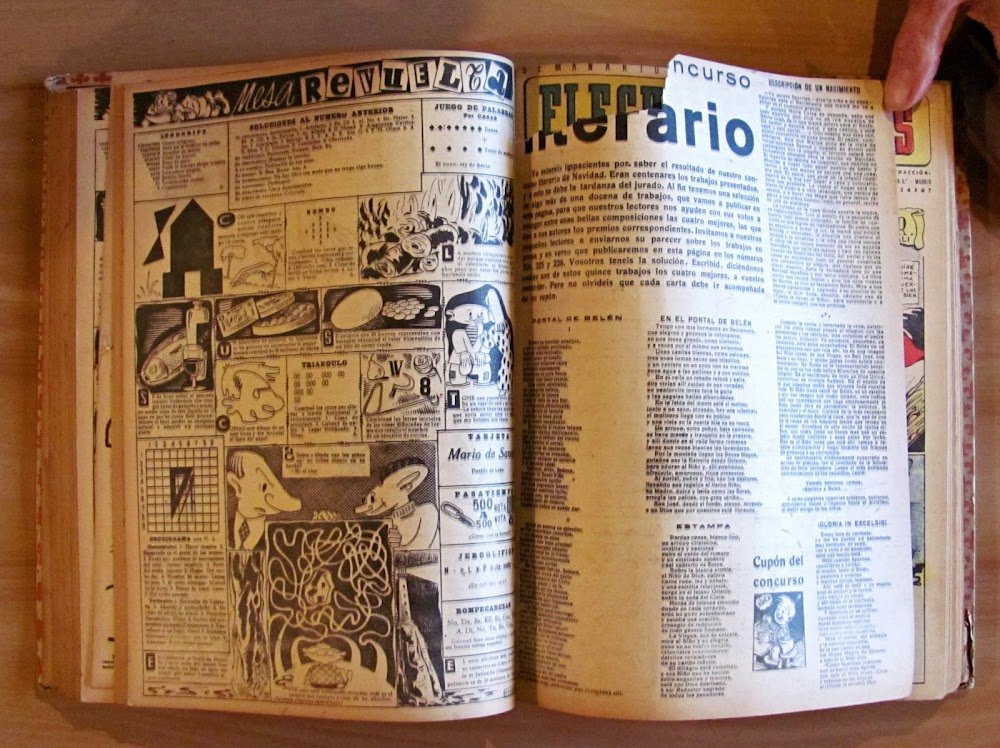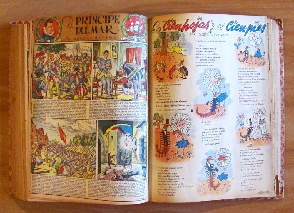 Semanario Nacional Infantil. Anno VI - N213/246 (- 216,223, 234, 241). 3 Gennaio - 29 Agosto 1943. Illustrazioni a colori alle copertine e in b/n e a colori n.t., anche a piena pagina, di diversi illustratori. Rilegatura coeva con imperfezioni del tempo alla cuffia inferiore del dorso e spellatura alla retrocopertina. Qualche piccolo taglio e lievi barbe al margine esterno di qualche pagina. Perfettamente legato e fruibile. 21,5x29. RARO e in BUONISSIMO STATO , Molto buono (Very Good)