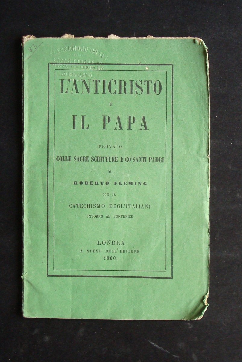 opucolo, L'ANTICRISTO E' IL PAPA provato COLLE SACRE SCRITTURE E CO' SANTI PADRI DI ROBERTO FLEMING CON IL CATECHISMO DEGLI'ITALIANI INTORNO AL PONTEFICE Londra,1860, cm 19 x 12,5, pp. 32, br.ed., Condizioni di conservazione. Esemplare in buono stato con leggere tracce d'uso e del tempo, piccole mancanze al dorso, br. ant. con piccoli strappetti agli angoli e piccolissimo forellino,br. post, tracce di piega e piccole mancanze, interni con qualche brunitura e mini strappetti ai margini OPEB.3030 BLU