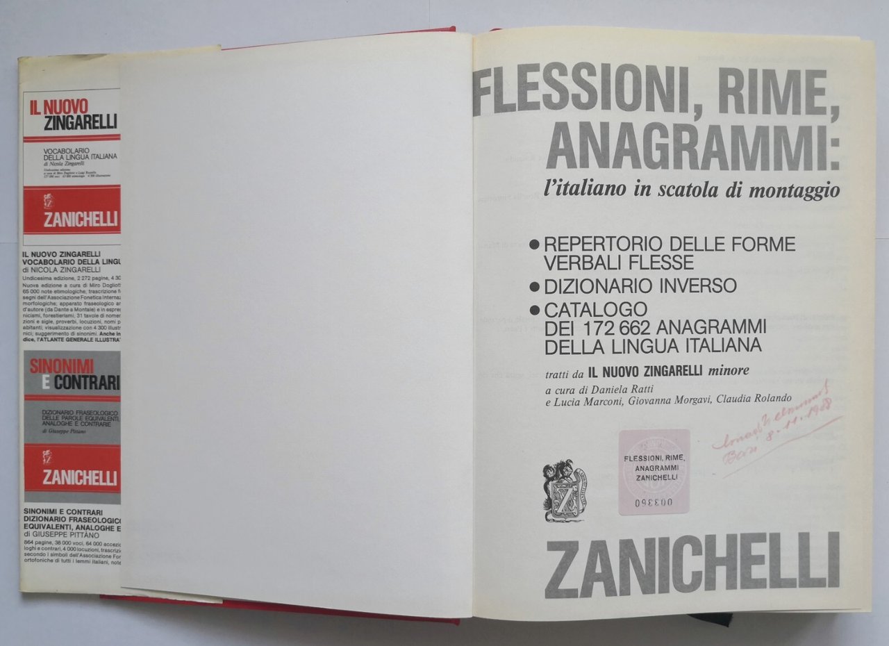 FLESSIONI RIME ANAGRAMMI l'italiano in scatola di montaggio repertorio delle forme verbali flesse, dizionario inverso, catalogo dei 172662 anagrammi della lingua italiana, tratti da Il Nuovo Zingarelli Minore a cura di Daniela Ratti, Lucia Marconi, Giovanna Morgavi, Claudia Rolando.