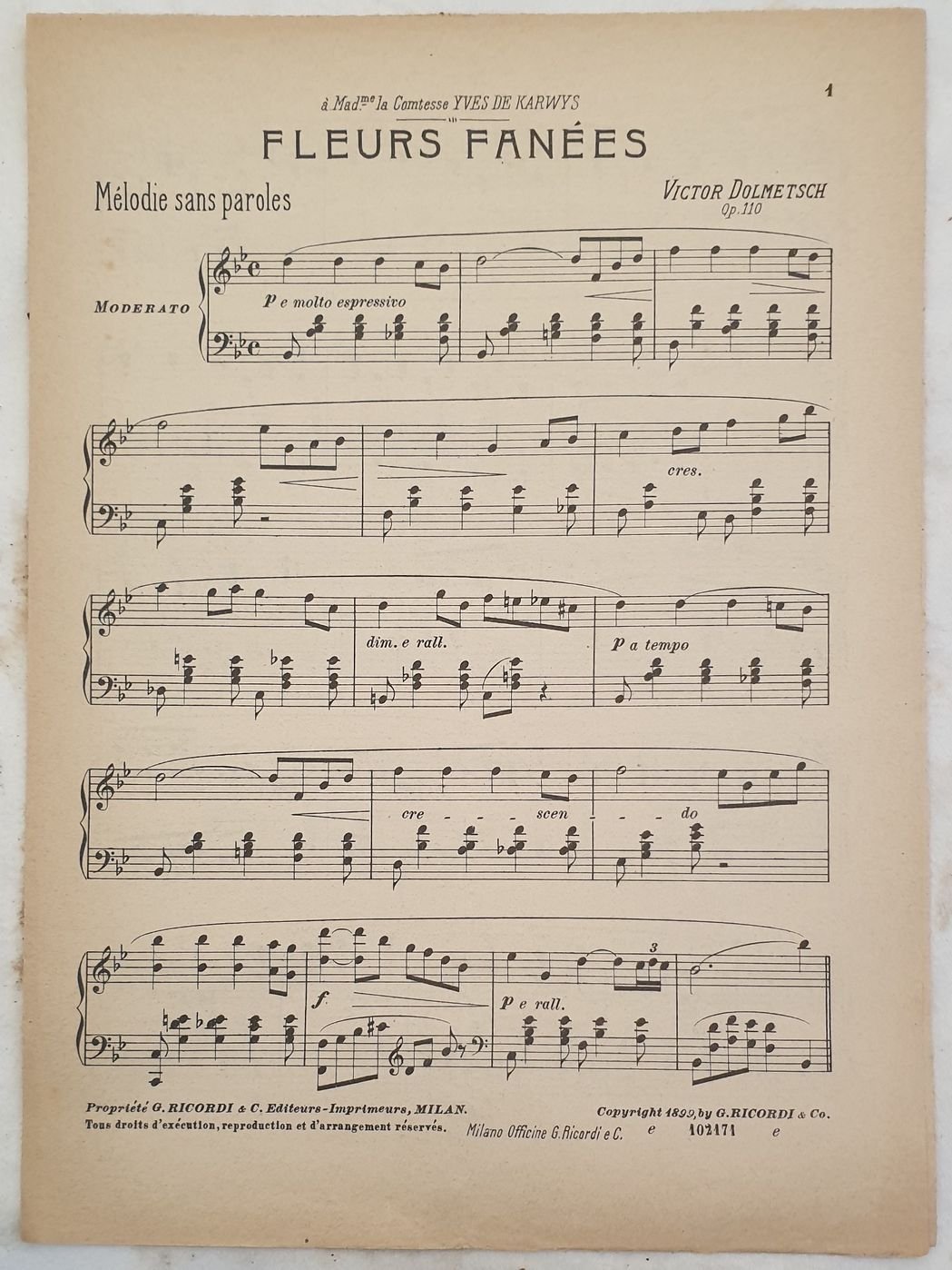 Partitura per pianoforte del 1899 della melodia "Fleurs fanees" dall'opera 110 del compositore francese Victor Dolmetsch (1852-1904). In buone condizioni con rare fioriture. Formato cm. 32,5x23,5. Pp. 4.Musical score for piano of 1899 of the melody "Fleurs fanees" from the work 110 by the french composer Victor Dolmetsch (1852-1904). In good conditions with occasional foxings. Size cm. 32,5x23,5. Pp. 4.