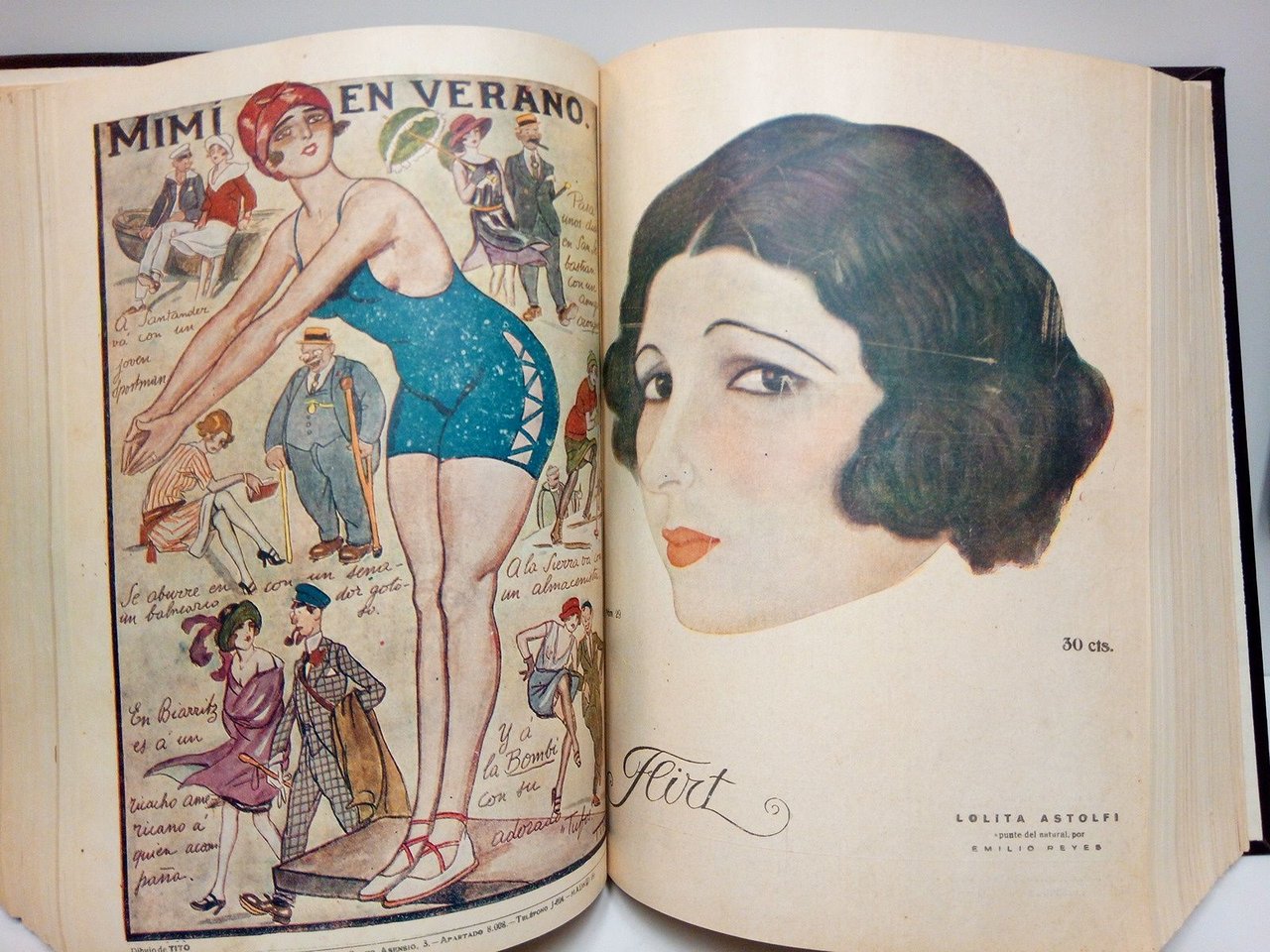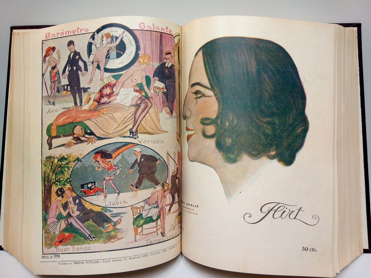 Madrid: Prensa Popular, Año 1, Nº 1 (9-2-1922. Falto de las la cubierta y siguientes 3 hojas) a Año 2, Nº 73 (28-6-1923). [No se ofrece el extraordinario, Almanaques para 1922 que iba sin numerar] El extraordinario, Almanaque para 1923 si lo tenemos; 4º mayor (27,7 x 19,7 cm); Un Tomo encuadernado en Pleno Guaflex imitando piel.- FATAN LOS Nos.: 53, 56 (del que solo tenemos la cubierta anterior), 64, 65, 67 y 72.- RARA REVISTA.* El Nº 1 se encuentra falto de la Cubierta anterior y las tres hojas siguientes. También falta el extraodinario Almanaque para 1922. Y del Nº 56 solo tenemos la cubierta anterior. Además señalar que por negligencia del encuadernador, la colocación de varios números es arbitraria y confusa, sobre todo los últimos números. Por lo demás en muy buen estado estado. Se ofrece gran parte de la primera época, ya que dejó de publicarse en el Nº 96. Publicándose solamente en 1924 y 1925, 15 Números más hasta el Número 111 del 29-3-1925, concluyendo así esta magnífica revista. Arquetipo de las denominadas revistas galantes o ligeras, es considerada como la primera revista madrileña de este tipo, editada con elegante sentido artístico por Prensa Popular. Fue fundada y dirigida por José de Urquía. Aparecía los jueves en números de 16 páginas, con reportajes, artículos narraciones cortas, antologías y viñetas, especialmente humorísticas. Su portada estaba reservada a una artista y en su interior contenía bellas ilustraciones, con una limpia impresión a todo color, algunas de ellas a toda plana. Intervinieron en esta Revista los más destacados escitores y periodistasde su tiempo como, Federico García Sanchíz, Manuel Linares Rivas, Wenceslao Fernández Flórez, Emilio Carrere, Joaquín Belda, Antón de Olmet, Rafael Cansinos Assens, Ramón Gómez de la Serna (en su sección, “La mujer de la semana”), Alvaro de Retana, Pedro de Répide, Hernández Catá, Joaquín Belda, Vargas Vila, o Tomás Borrás, entre otros muchos. También entre los ilustradores estuvieron artistas como, Manuel Tovar, Emilio Reyes, Robledano, Larraya, Penagos, Perals, Ribas o Tito. La revista tuvo dos épocas bien diferenciadas. La primera hasta el 16 de septiembre de 1923, y la siguiente, en la que sufrió la censura de la Dictadura de D. Miguel Primo de Rivera, hasta su final definitivo en 1925. EROTISMO, LITERATURA ERÓTICA, SEXOLOGÍA, PROSTITUCIÓN