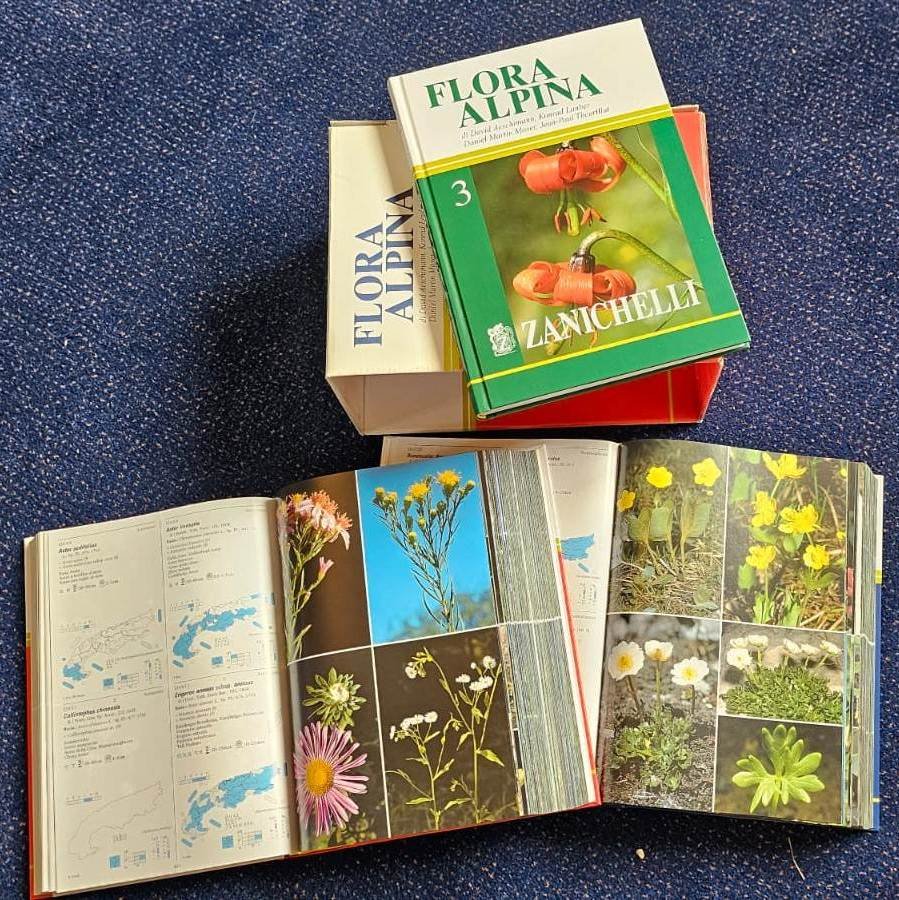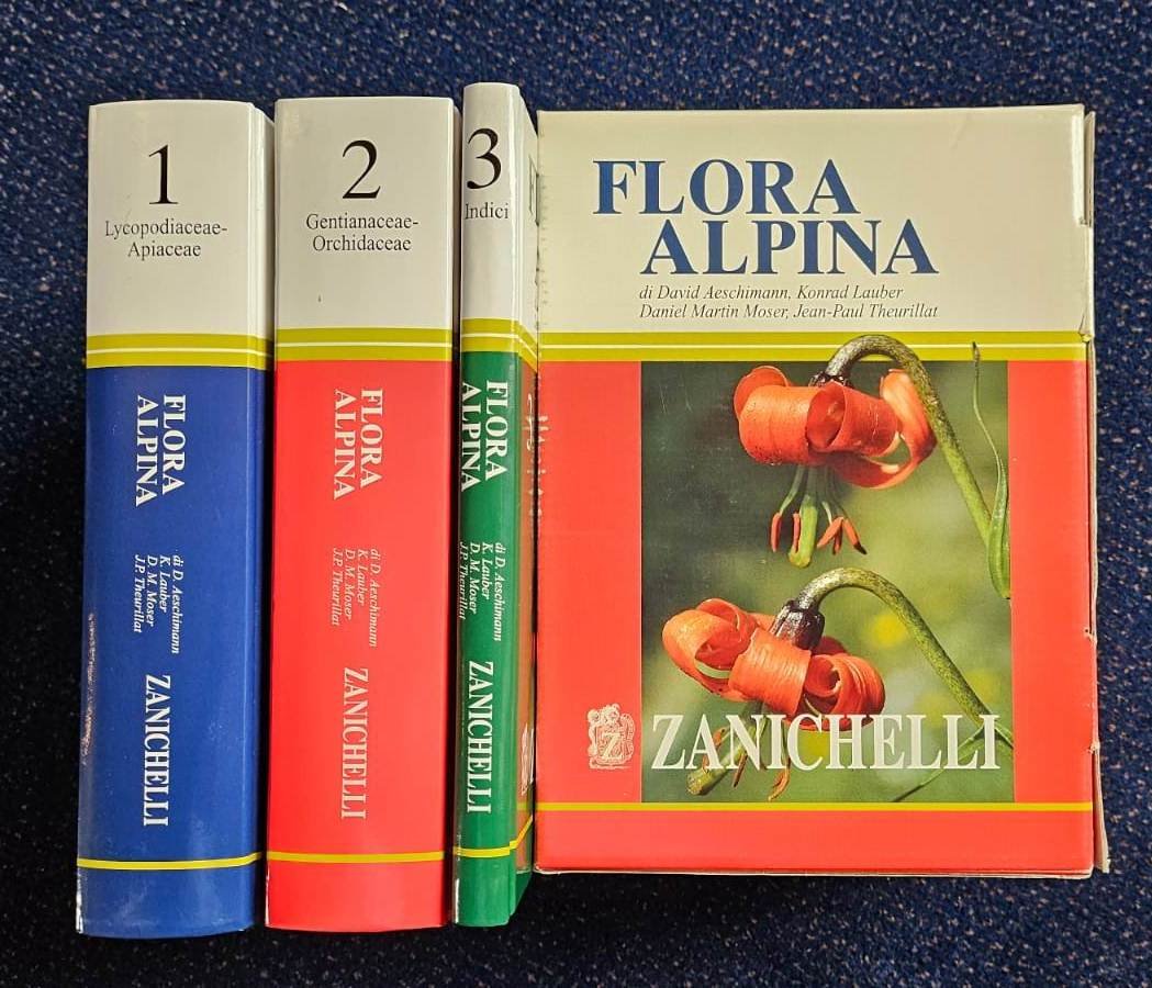 3 Voll. (mm.250x185) pagg.1159; pagg.1188; pagg.323. Legature cartonate editoriali con titoli ed illustrazioni fotografiche ai piatti; cofanetto editoriale illustrato. Ottimo esemplare completo delle 3 carte plastificate a piena pagina non rilegate contenenti la distribuzione delle varietà vegetali lungo l'arco alpino. Profusamente illustrato da foto a colori.