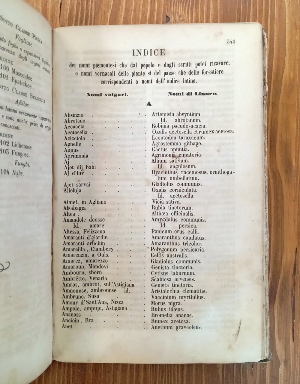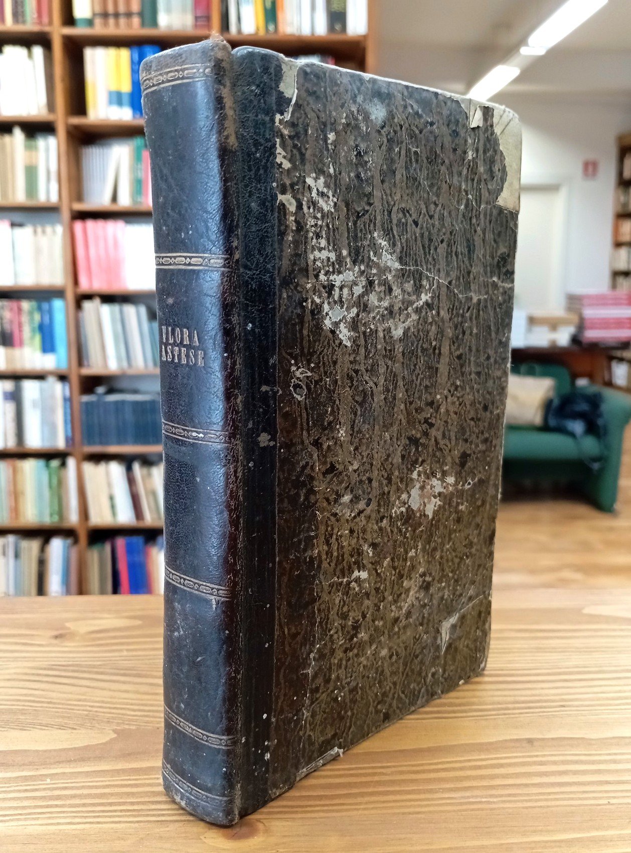 Prima edizione - Volume rilegato in mezza pelle con titolo in oro al dorso, fogli di guardia non originali in carta bianca filigranata, 488 pagine. Al testo principale seguono diversi indici, nello specifico: "Indice dei nomi piemontesi che dal popolo e dagli scritti potei ricavare, o nomi vernacolari delle piante sì del paese che delle forestiere corrispondenti a nomi dell'indice latino" (pp. 343-375); "Indice de' nomi francesi, corrispondenti all'indice latino secondo il sistema di Linneo" (pp. 376-391); "Indice dell'opera di Mattiolo che molti farmacisti e veterinari possedono corrispondente all'Indice latino indicante i nomi generici e specifici delle piante medicinali sull'Astigiana crescenti" (pp. 392-401); "Indice delle piante officinali per uso della farmacia corrispondente all'Indice latino" (pp- 402-410); "Tavola nosologica per uso popolare - colla descrizione de' nomi tecnici di alcune malattie citate in quest'opera e coll'indicazione della virtù di alcune piante indigene giudicate opportune alla relativa cura" (pp. 411-432); "Delle piante indigene dalle quai l'arte tintoria può estrar colori" (pp. 433-435); "Tavola sinottica dei generi della Flora Astese disposti secondo il sistema di Linneo" (pp. 439-470); "Indice latino dei generi e specie delle piante sul suolo Astese crescenti" (pp. 471-486). Segni di consunzione agli angoli di copertina, carte un poco brunite e con sporadici segnetti a matita; nonostante i segni d'uso e del tempo, l'opera risulta integra e fruibile in ogni sua parte; testo assai raro e ricercato.