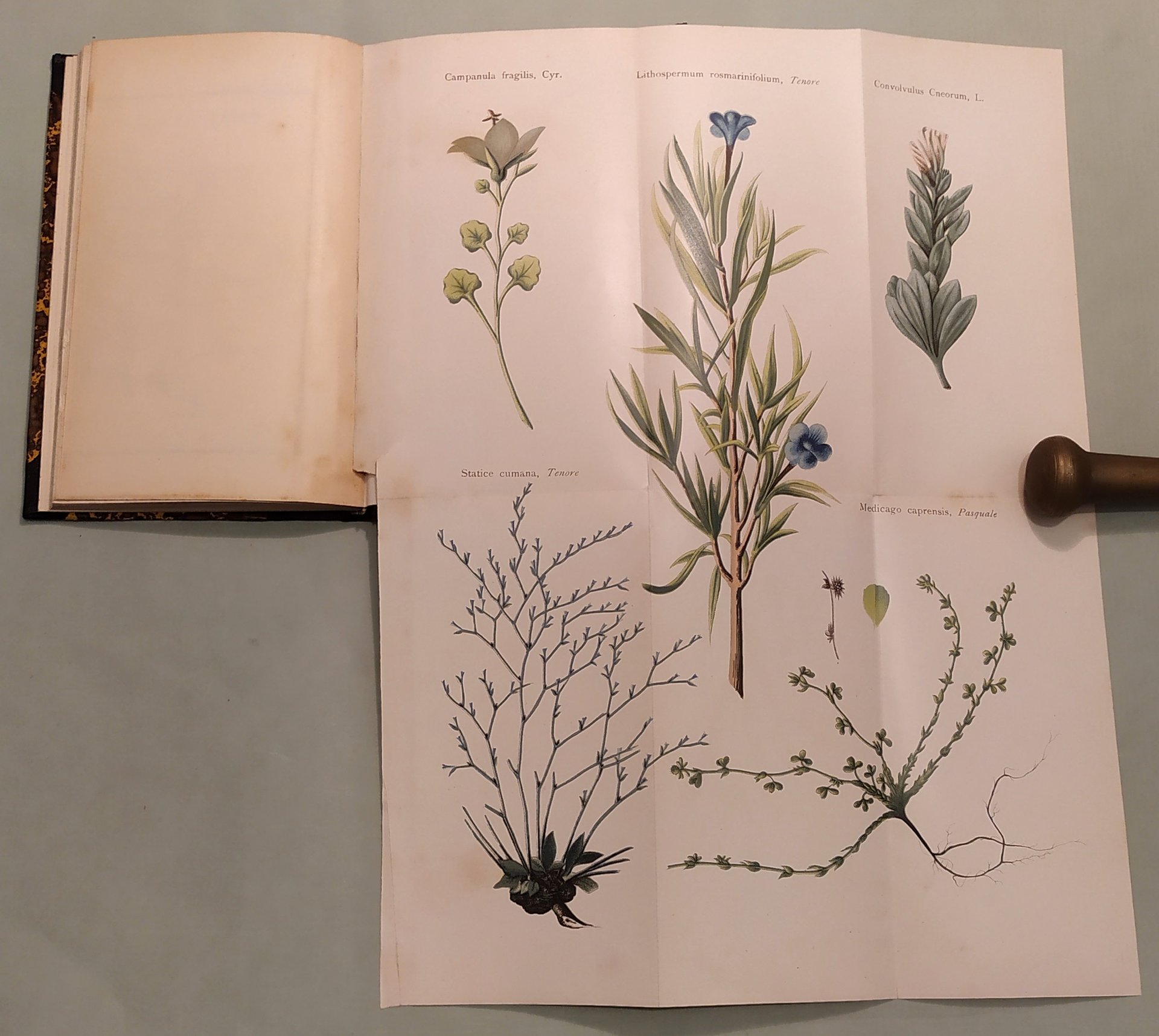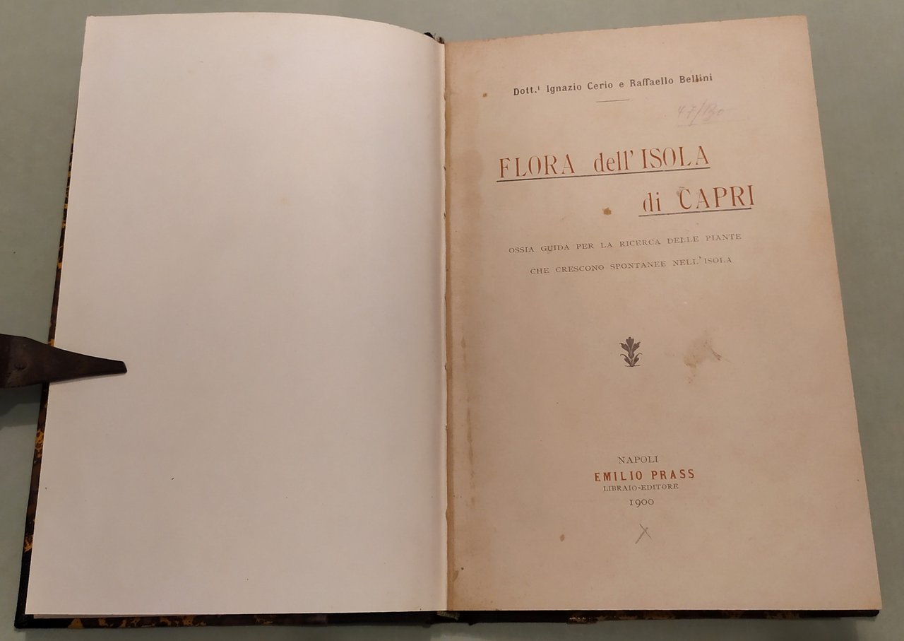 CERIO Ignazio BELLINI Raffaello. Flora dell'Isola di Capri ossia guida per la ricerca delle piante che crescono spontanee nell'Isola. Napoli, Emilio Prass, 1900. In 16mo; pp.95. In fine carta topografica dell'isola e tavola a colori che riproduce le piante di Capri tratte dal Tenore e Pasquale. Mezza tela con angoli. Doria 375 bis; Furcheim, pag.37; Sandomenico, pag. 128.