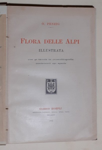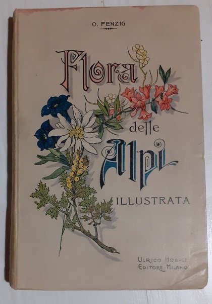 In 8° (20,5×13,3 cm), XIV, 98, (2) pp. e 40 tav. fuori testo. Bellissima legatura editoriale in tutta tela rigida con titolo e fiori colorati al piatto anteriore. Prima edizione assai rara e completa delle 40 tavv. f.t. in cromolitografia protette da velina di questo importantissimo studio sulla flora delle alpi del grande botanico e ricercatore scientifico tedesco, naturalizzato italiano dove visse e lavorò, Ottone Penzig. Nato in Slesia nellodierna Chojnow in Polonia, si laureò a Breslavia nel 1877. A causa di motivi di salute si trasferì prima in Costa Azzurra e poi in Italia, dove nel 1883 divenne direttore della Regia Stazione Agraria di Modena. Nel 1886 ottenne la cattedra di Botanica allUniversità di Genova che tenne per quarantanni. In seguito al matrimonio con Lucia Ottini di Breno in Valle Camonica, ed alla conseguente frequenza in quella valle, Ottone divenne amico di escursionisti del luogo e lui stesso fu escursionista, fatto al quale diede immediatamente significato scientifico, preparando per la flora e per altri reperti naturali (soprattutto fossili) del luogo, specifiche ricerche e pubblicazioni, nonché raccolte di campioni. Fondò e diresse Malpighia che restò per lungo tempo, la più importante rivista di botanica in Italia. Fu uno dei fondatori della Società Teosofica Italiana. A causa delle sue origini tedesche fu perseguitato e minacciato dai nazionalisti italiani e costretto durante il periodo bellico a ritirarsi a Loisine in Valle Camonica dove la moglie aveva grandi proprietà. Lo studio qui presentato è considerato come uno dei più importanti dedicati alla flora alpina. Bellissime le tavole botaniche in cromolitografia. Prima edizione (una seconda uscì qualche anno dopo) non comune ed in buone-ottime condizioni di conservazione.