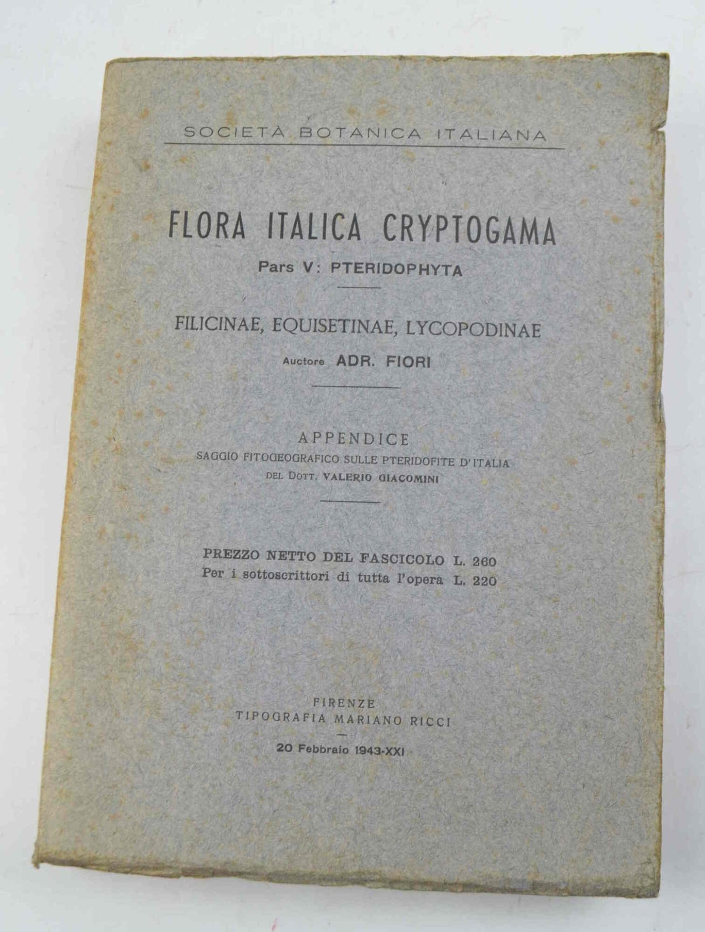 Flora italica cryptogama. Pars. V: Pteridophyta. Filicinae, Equisetinae, Lycopodinae. Appendice. Saggio fitogeografico sulle ptedofite del dott. Valerio Giacomini.