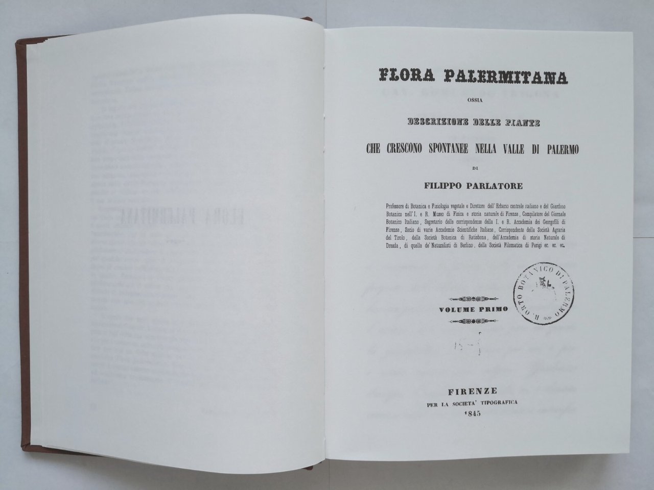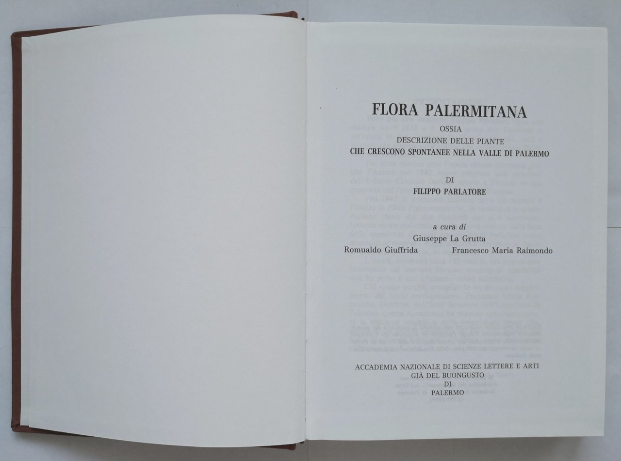 FLORA PALERMITANA di Filippo Parlatore (1845). Ossia descrizione delle piante che crescono spontanee nella valle di Palermo. A cura di Giuseppe La Crutta, Romualdo Giuffrida, Francesco Maria Raimondo. Reprint dell'opera stampata a Firenze nel 1845.