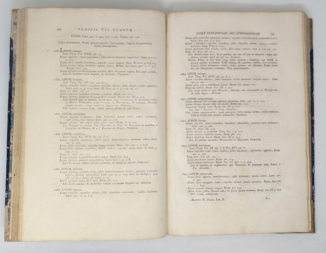 Si tratta dell'opera più importante del botanico Carlo Allioni (Torino, 1728-1804), estremamente importante dal punto di vista scientifico ed iconografico e considerata uno dei primi erbari regionali. L'Autore, soprannominato "il Linneo piemontese", fu professore dell'Università e direttore dell'orto botanico dopo il Donati, ed uno de' benemeriti della Flora Italica. Rara a trovarsi completa ed in ottimo stato.