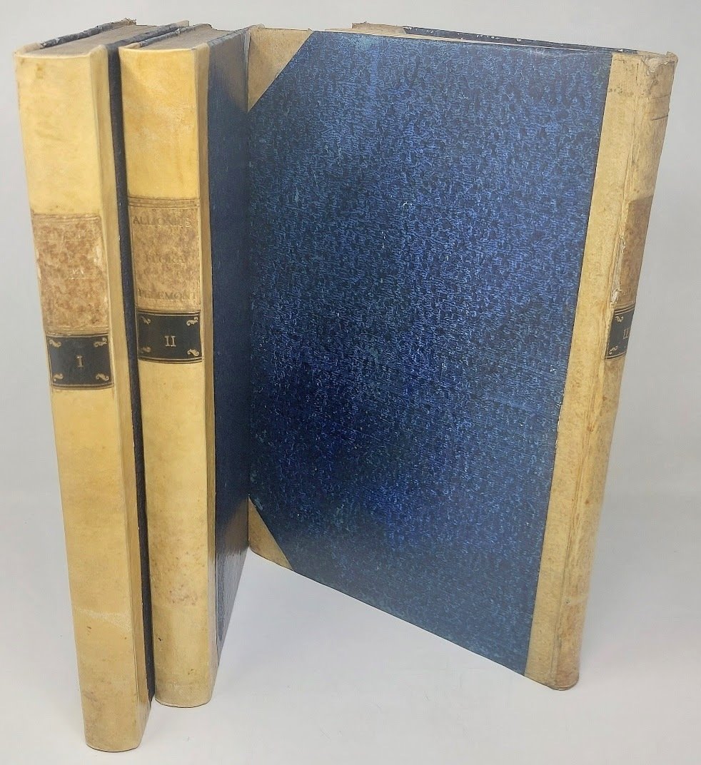 Prima edizione di questa straordinaria e prestigiosa pubblicazione sulla flora di montagne e vallate del Piemonte, frutto del lavoro di 25 anni di ricerca. "I due primi volumi contengono la descrizione di 2800 piante, e l'ultimo dà la figura di 257 specie esattamente disegnate, col luogo della nascita, le qualità del suolo, il nome vernacolo piemontese, e le facoltà medicinali di esse piante" (Saccardo, "La botanica in Italia", I, p.13).