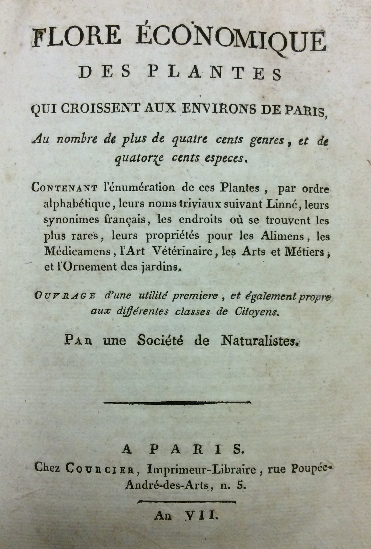 In-8 p. (mm. 211x130), cartonato muto coevo (pesanti tracce duso), pp. VIII,659. Contenant l'énumeration de ces plantes, par ordre alphabétique, leurs noms triviaux suivant Linné, leurs synonimes français, les endroits où se trouvent les plus rares, leurs propriétés pour les Alimens, les Médicamens, l'Art Vétérinaire, les Arts et Métiers, et l'Ornement des jardins. Ouvrage d'une utilité premiere, et également propre aux différentes classes de citoyens.Fori di tarlo in tutto il volume che a volte intaccano il testo. Discreto esemplare.