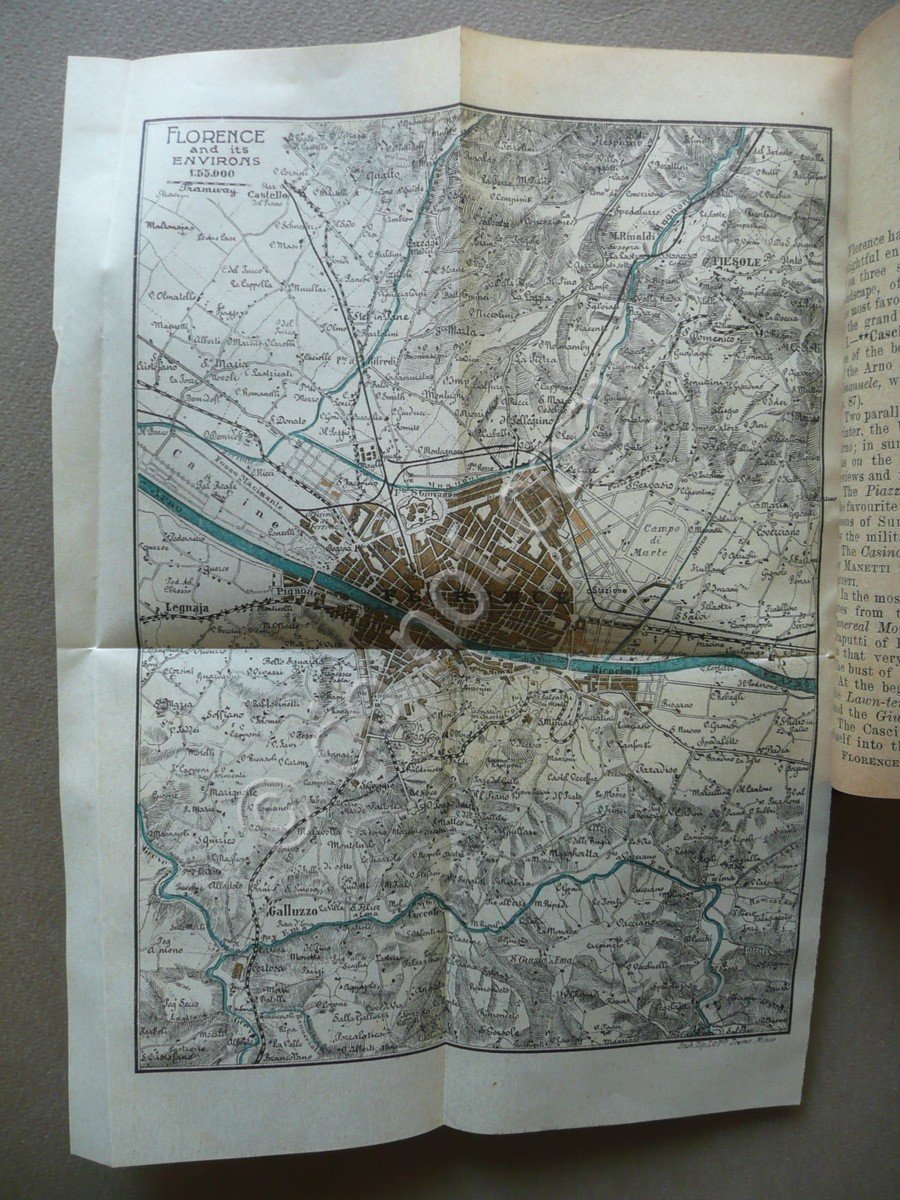 Guida turistica, Florence and its environs with plans of Florence, of the Environs, of the Uffizi and Pitti Galleries, of the Archaeological and National Museums, and 32 engravings Fratelli Treves Publishers, Milano 1911, cm 15,5x10, pp. 159 con 32 ill. in b/n fuori testo e due carte a col. rip. più volte anch'esse fuori testo, cm 37x45,5 (carta di Firenze); cm 23x16,5 (Firenze e dintorni), tutta tela ed. con titolo in oro al dorso e al piatto ant. Testo in inglese. Condizioni di conservazione Esemplare complessivamente in buono stato con tracce d'uso, coperta con lievi abrasioni e qualche piccola mancanza, angoli arrotondati. Interni buoni, prima pagina con leggera apertura al dorso, esemplare compatto, carta della città di Firenze con qualche lievissima brunitura e minimi difetti ai margini e agli angoli, carta di Firenze e dintorni con lievi tracce di pieghe a un margine. In aggiunta alle illustrazioni sono presenti due carte a colori fuori testo, una della città di Firenze, l'altra di Firenze e i suoi dintorni. Testo in inglese. SETT75.L6650 N P