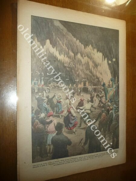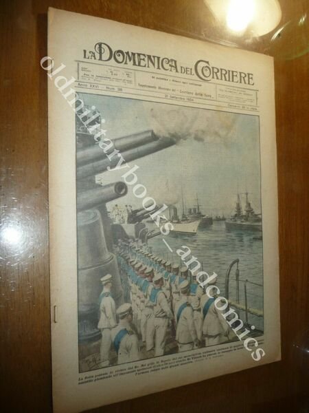 DESCRIZIONE: Domenica del Corriere, Anno XXVI n. 38 (21 settembre 1924). COPERTINA: Re Vittorio passa in rassegna la flotta nel Golfo di Napoli. RETRO: Ballo unico al mondo nelle grotte di Postumia. La Domenica del Corriere è stato un popolare settimanale italiano fondato a Milano nel 1899 e chiuso nel 1989. Apparve per la prima volta nelle edicole l'8 gennaio 1899 come supplemento illustrato del Corriere della Sera. Stampata in grande formato (sul modello del domenicale La Tribuna illustrata), aveva 12 pagine e veniva distribuita gratis agli abbonati del Corriere, oppure si poteva acquistare in edicola per 10 centesimi. La prima e ultima di copertina erano sempre disegnate. Il Corriere si avvaleva di un giovane disegnatore, Achille Beltrame, allora sconosciuto, a cui veniva affidato in ogni numero il compito di rendere con la sua tavola il fatto più interessante della settimana. Dopo la sua morte nel 1945, fu sostituito da Walter Molino che, come il suo predecessore, firmò memorabili copertine. A differenza dei settimanali dell'epoca, la Domenica del Corriere diede ampio spazio alle fotografie e ai disegni, e questo fu uno dei motivi del suo successo. CONDIZIONI: Ottime, senza azzurrina. PESO / WEIGHT: 100 gr. without package