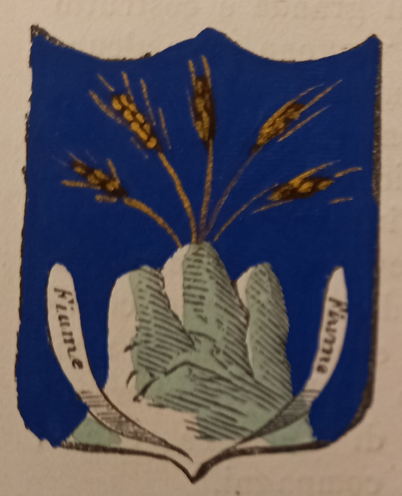 Piccolo stemma comunale colorato a mano d’epoca (cm. 3,8 x 3,2 ca.). Stralcio dal Dizionario Corografico illustrato dell’Italia, edito a Milano nel 1868. Ogni stemma di questa raccolta è inserito in una o più pagine di testo con la descrizione della località, notizie storico - geografiche e statistiche (numero degli abitanti e degli elettori, guarnigioni della Guardia Nazionale, ecc.). Spesso il testo è redatto da studiosi locali o dai sindaci, con maggiori, interessanti notizie.