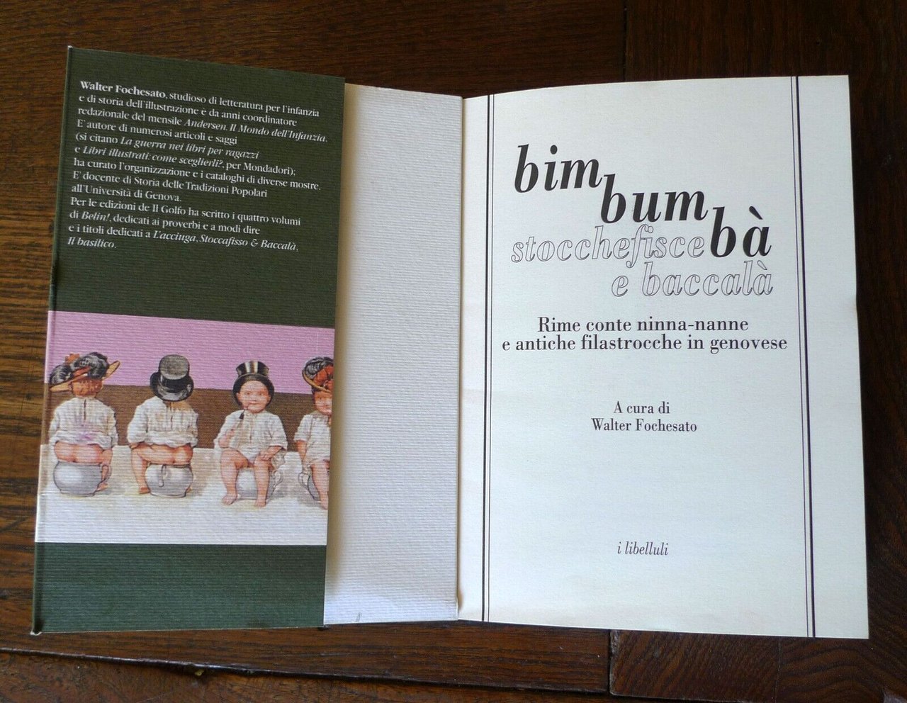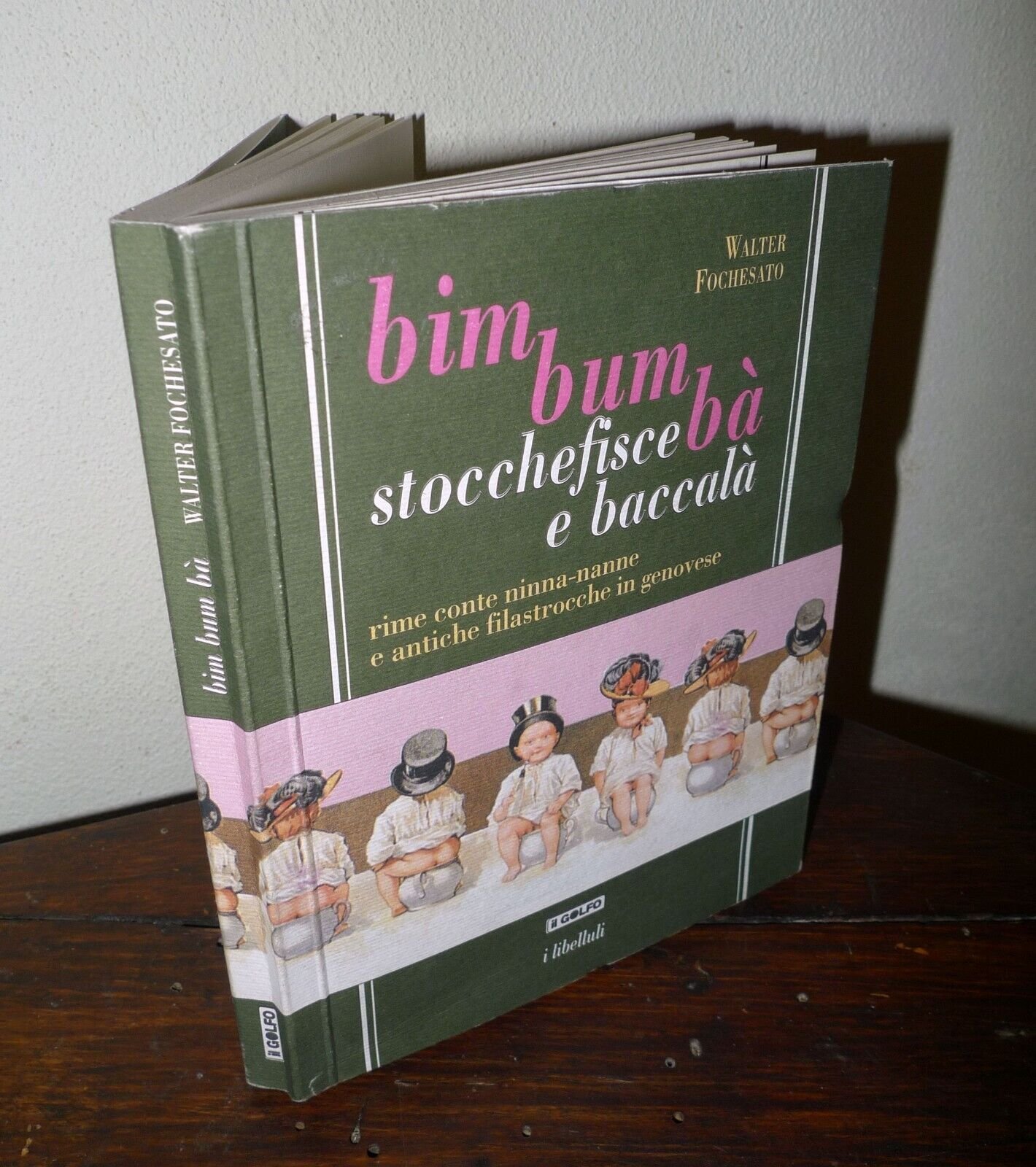 A cura di Walter Fochesato,BIM BUM BÀ STOCCHEFISCE E BACCALÀ.Rime conte ninna-nannee antiche filastrocche in genovese.Feguagiskia' Studios Edizioni, Genova 2003,supplemento al mensile NBN New Book News,Il Golfo n.1 2003,brossura, 16x12 cm., pp.124,illustrazioni in nero e a colori,collana I LIBELLULI,peso: g.250