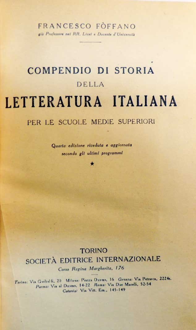 Francesco Foffano, Compendio di storia della letteratura italiana per le scuole medie superiori, Società Editrice Internazionale, Torino 1936, quarta ed. riveduta e aggiornata secondo gli ultimi programmi, pp. 443, cm 21, legatura in mezza tela con titoli in oro mal dorso. Etichetta con segnatura di collocazione al dorso, sottolineature e annotazioni a lapis non deturpanti, accenni di fioriture alle pagine di guardia, per il resto volume ancora ben conservato e con legatura solida.