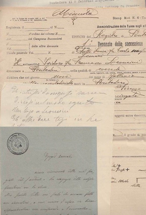 Fogli Manoscritti E Dattiloscritti Aventi Come Soggetti Isidoro Leoncini Domiciliato A Pontedera E Giulia Masini Come Mandataria Del Sig. Massimo Chelli In Relazione Ad Un Atto Privato Di Cessione E Liquidazione Ereditaria.