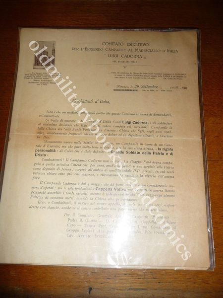 FOGLIO DEL COMITATO PER L'ERIGENDO CAMPANILE MARESCIALLO D'ITALIA LUIGI CADORNA
