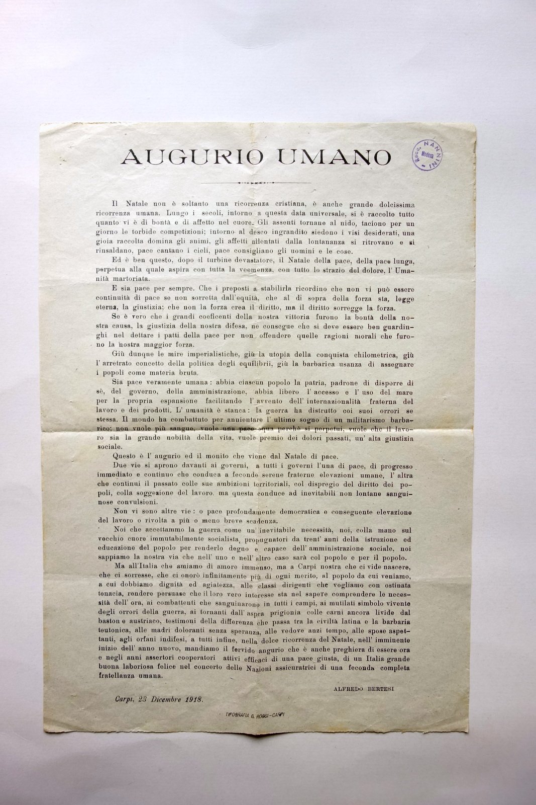Foglio volante, Augurio Umano" - firmato Alfredo Bertesi Carpi, 23 dicembre 1918 Tip. G. Rossi, Carpi 1918; foglio volante a stampa su carta; retro bianco. All'angolo superiore destro ex libris del precedente collezionista. Cm 35x24,5. Condizioni di conservazione Esemplare in buone condizioni con leggere tracce d'uso, pieghe di conservazione. Bel messaggio di pace in occasione del natale 1918, di forte impronta umanitario-socialista. SC03.D17806 N "