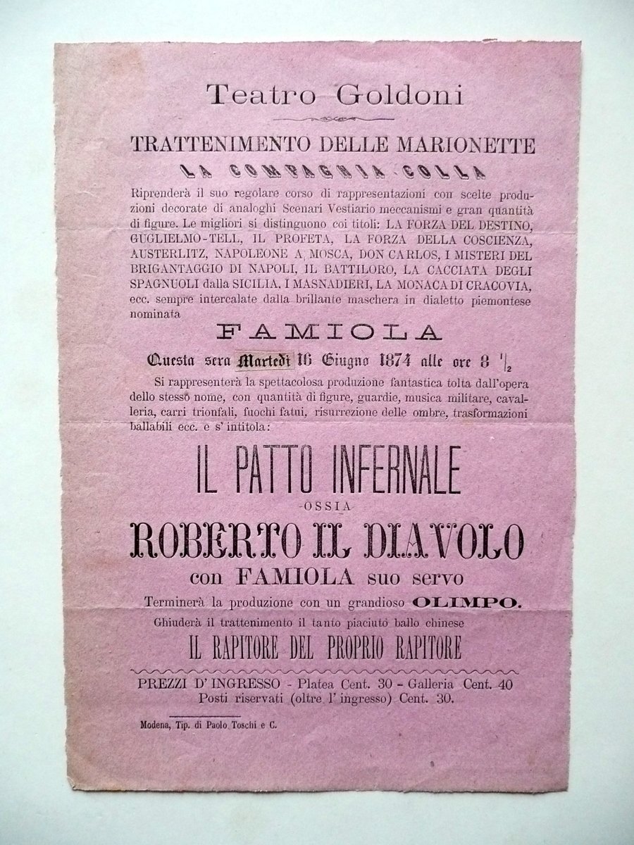 Foglio volante, Teatro Goldoni Trattenimento delle marionette La Compagnia Colla Riprenderà il suo regolare corso di rappresentazioni [.] Sempre intercalate dalla brillante maschera in dialetto piemontese nominata Famiola Questa sera martedì 16 giugno 1874 alle ore 8,30 [.] Il Patto Infernale ossia Robertoil Diavolo con Famiola suo servo [.] Tip. di Paolo Toschi e C., Modena 1874; foglio volante a stampa su carta rosa chiaro; giorno della rappresentazione rettificato mediante etichetta a stampa applicata (vedi foto). Cm 23x16. Condizioni di conservazione Esemplare ben conservato con leggere tracce d'uso, lievi pieghe di conservazione; un margine est. con pressoché trascurabili accenni d'ingiallimento. Foglio volante - volantino molto raro. SC03.D11434 N