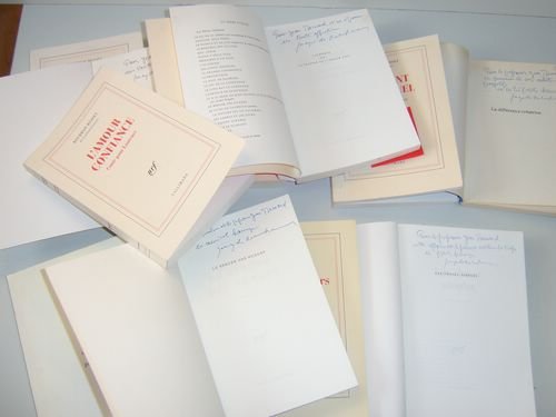 11 vol. in-8 br. dont Foi jurée, esprit libre, Desclée de Brouwer, 1992, 160 pp. - L’empire de la passion, PUF, 1984, 127 pp. - La différence créatrice, CERF, 1979, 138 pp. - et les autres volumes collection NRF Galllimard : L’instant perpétuel. Récits pour Laurence, édition originale sur papier ordinaire, dont il n’est pas fait mention de grand papier, 1991, 172 pp. - L’esprit de la forêt. Contes pour Laurence, 1993, 179 pp.- Laurence ou la sagesse de l’amour fou, 1989, 171 pp. - Le berger des nuages, 1982, 217 pp. - L’amour confiance. Conte pour Laurence, 1995, 235 pp. - Les choses simples. Journal VIII, 1980, 264 pp.- La force des jours. Journal IX, 1981, 214 pp. - Bien plus qu’aux prmiers jours. Journal X, 1985, 280 pp. Bon ensemble (couv. et tranches lég. frottées) dont chacun des 11 ouvrages a été dédicacé par Jacques de Bourbon Busset à son confrère de l’Académie Française, le grand médecin, poète et humaniste, le professeur Jean Bernard. Prix du lot pour ce bel ensemble enrichi d’envois de l’auteur. Avec signature de l'auteur