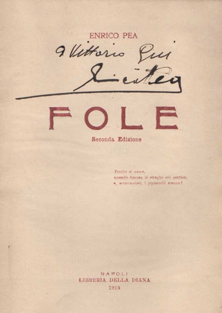 LIBROSeconda edizione, emissione “di lusso” in tela.Esemplare con fotografia applicata alla tela con bordi bianchi e immagine più piccola. Ottimo, con normali tracce di usura alla brossura e carte e tagli lievemente bruniti.«Fole» è l’opera prima di Pea, pubblicata in prima edizione a proprie spese nel 1910, dietro consiglio di Giuseppe Ungaretti che quindi ne caldeggiò la riedizione per i tipi della Diana di Gherardo Marone. Tecnicamente tuttavia l’editore napoletano non fece altro che utilizzare le rese della stampa originale, rifilate, ricopertinate e con nuovo frontespizio (sono evidenti i testimoni dell’interpolazione per cui le prime quattro pagine originali sono sostituite da risguardo e frontespizio, siccome l’ultima carta da un nuovo foglio di sottoscrizione tipografica con l’indicazione del tipografo Marrai). -- Non solo: La Diana pubblicò un’emissione di lusso legata in una raffinata tela decorata con gusto Liberty e fotografia del busto dell’autore applicata al piatto anteriore (costo «Lire tre» in quarta di copertina), quindi altre due emissioni in brossura (al prezzo di L. 1,50, una «II. edizione» e l’altra «II. Edizione - IV. migliaio» con data 1919 in copertina). Tutte le emissioni sono oggi rare, tanto è vero che non ci si può ancora dire soddisfatti dalle registrazioni bibliografiche esistenti, pure accurate.Cammarota, La Libreria della Diana & C., n. 63 (con imprecisioni)