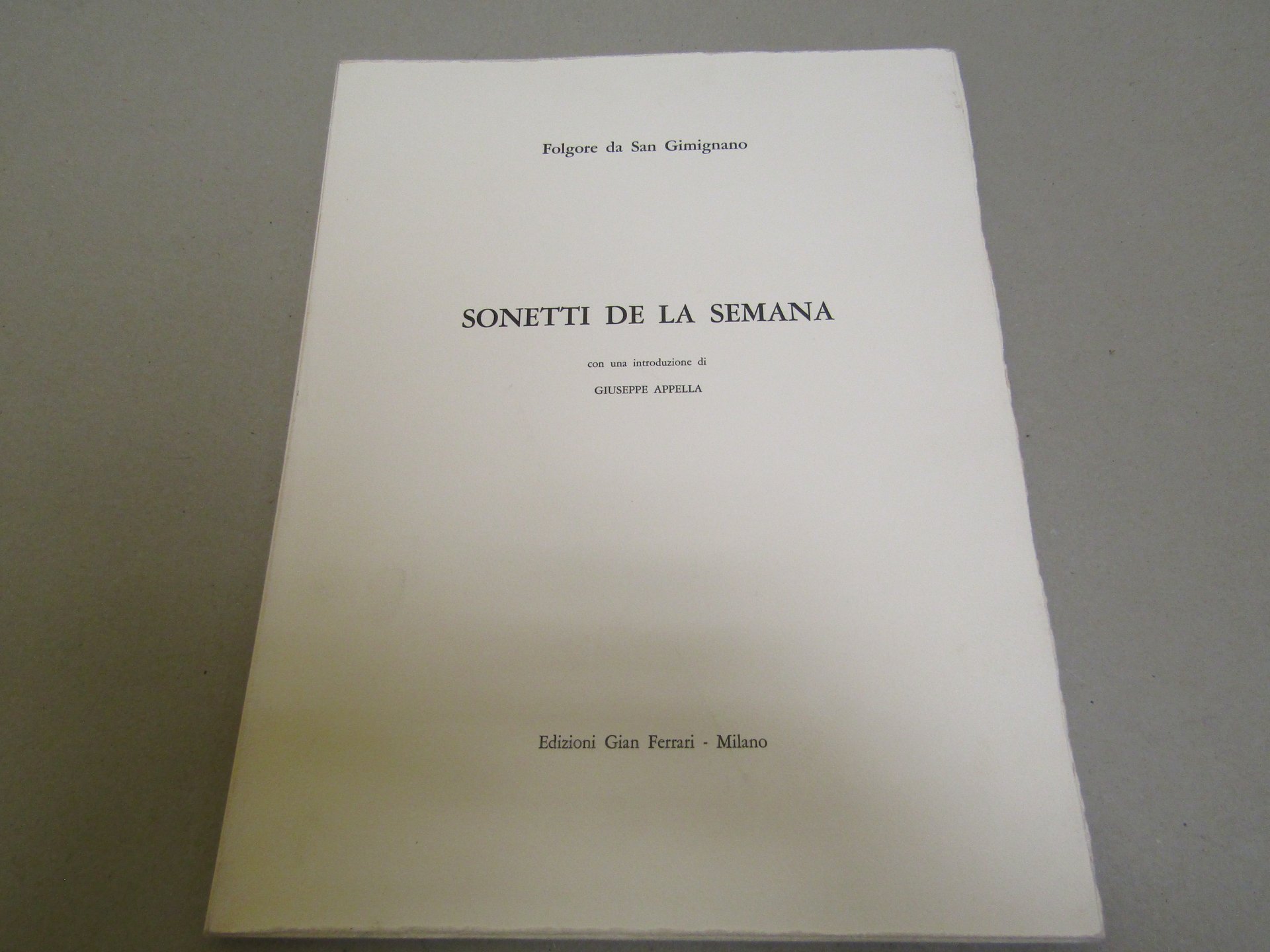 Intoduzione di Giuseppe Apella - acqueforti di Ossi Folgore da San Gimignano. Sonetti de la semana. Milano, Gian Ferrari 1966 italiano, in folio pp. 6 acqueforti Cartella editoriale in folio grande contenente sette acqueforti di Ossi (in fogli volanti con il sonetto da un lato e l'acqueforte f/t nell'altro). Copia mancante della settima acquaforte ( Domenica die "Alla dimane, all'apparer del giorno") e probabilmente della copertina della cartella originale. Di questo volume sono stati stampati 70 esemplari numerati e firmati dall'Artista, di cui 50 da 1 a 50, da I a X E 10 dall'A all'L (la nostra copia è la n. C - stampata dalla Tipografia Fabriano di Gianni Santini).