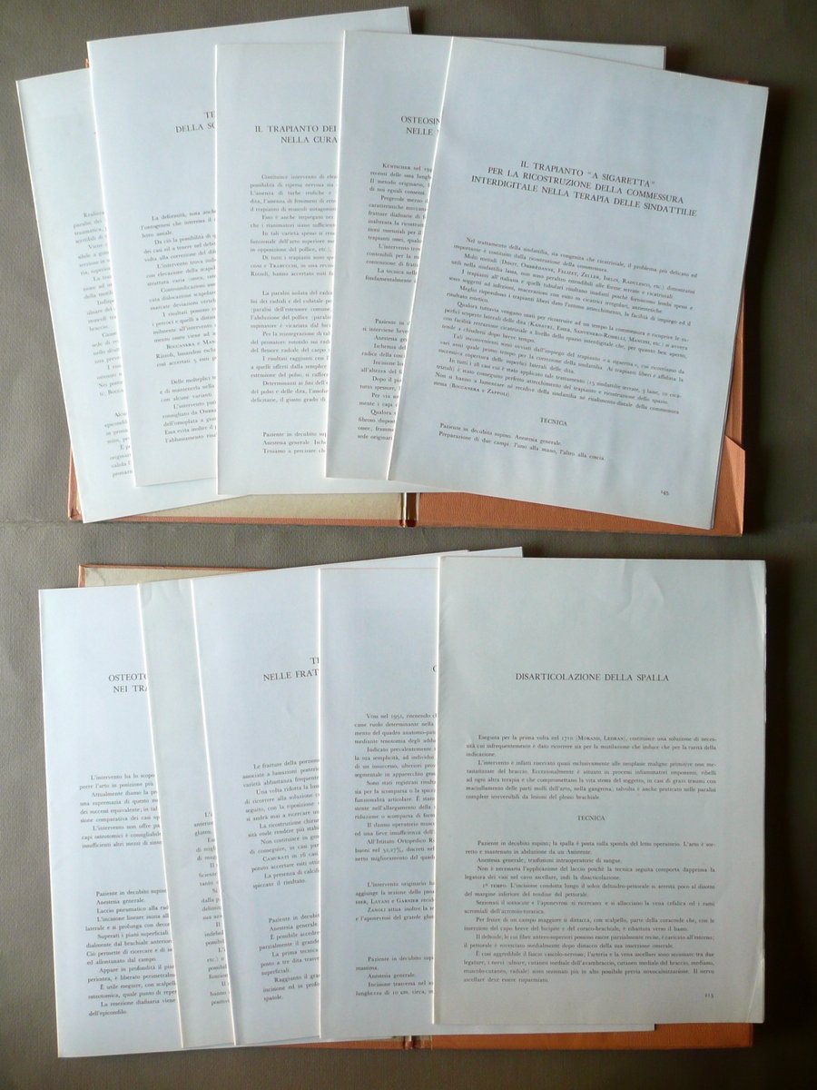 Quattro cartelle, Folia Orthopaedica quae ad artem chirurgiam pertinent series tertia Raphael Zanoli edidit Carolus Camurati - Lucianus Negri redigenda curaverunt Remus Scoto pinxit - Quattro cartelle Serie terza, quarta, quinta, sesta Apud Institutum Rizzoli, Bononiae 1961; cm 34x24,5; da pagina 145 a pagina 212 (serie terza); da pagina 213 a pagina 272 (serie quarta); da pagina 273 a pagina 332 (serie quinta); da pagina 333 a pagina 388 (serie sesta), tutte con varie ill. in b/n e a col. nel t.; esemplari a fogli sciolti contenuti entro cartella ed. con titolo in latino al piatto ant. Quattro cartelle corrispondenti ad altrettante serie, nello specifico alle serie terza - sesta. Accluso l'indice delle serie prima - quinta (vedi foto). Condizioni di conservazione Cartelle ben conservate con leggere tracce d'uso e pochi piccoli lievi aloni; angoli di qualche bandella con tracce di pieghette. Interni ottimi; serie sesta mancante delle pp. 357-368. Quattro cartelle corrispondenti ad altrettante serie, nello specifico alle serie terza - sesta. Le serie terza - quinta sono complete. La serie sesta è mancante delle pagine 357-368. Accluso l'indice delle serie prima - quinta (vedi foto). SETT139.L13769 N