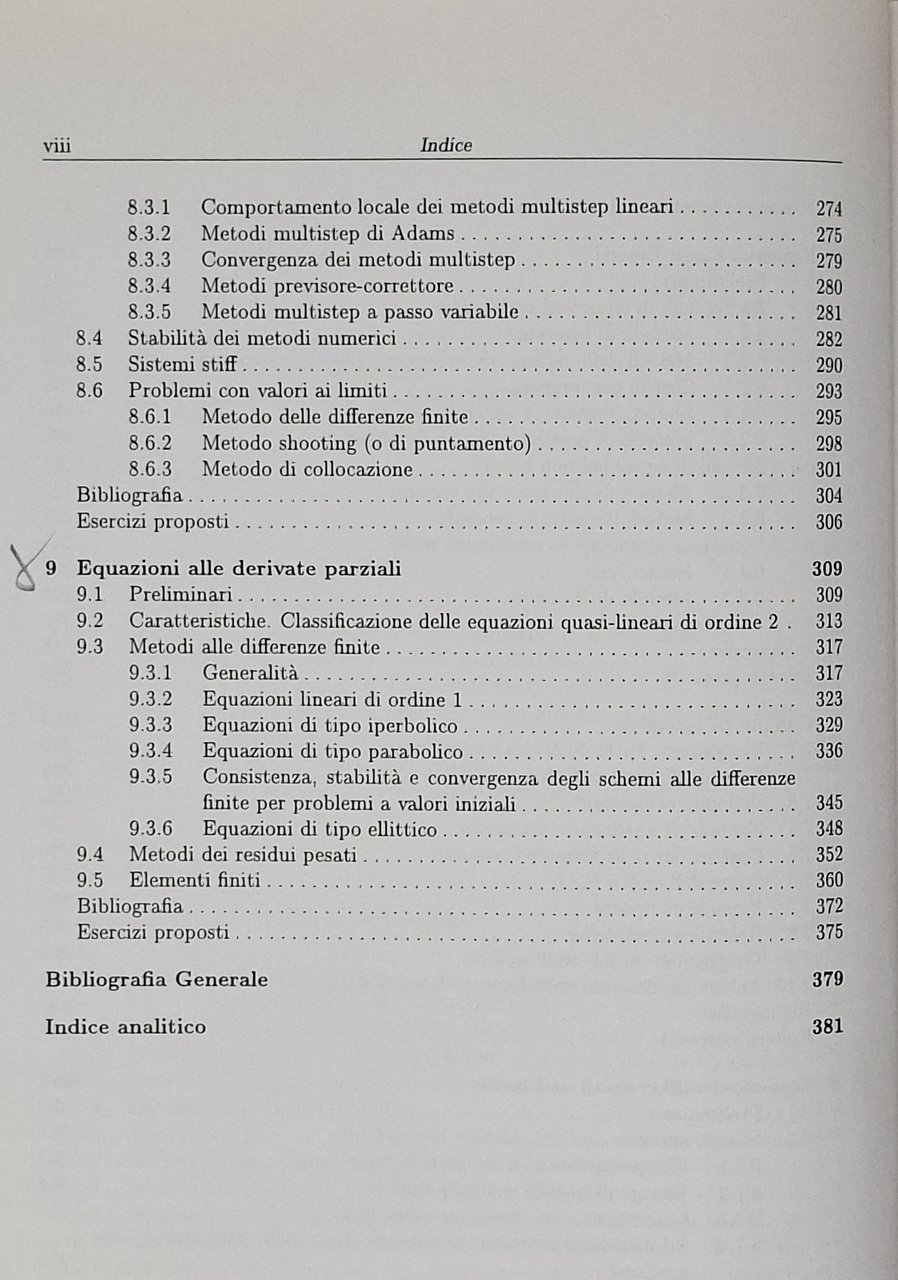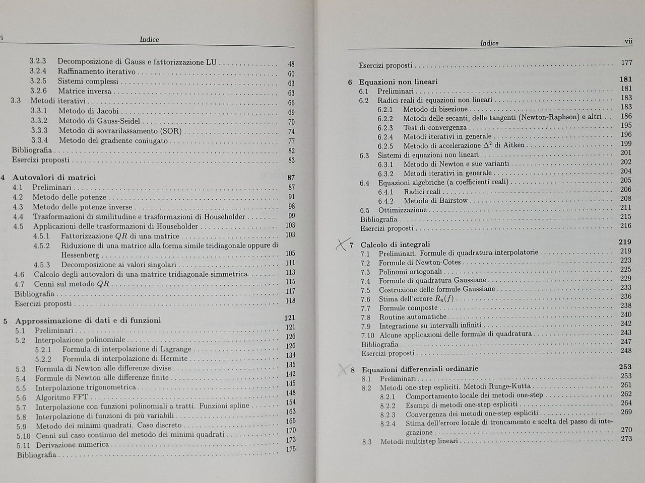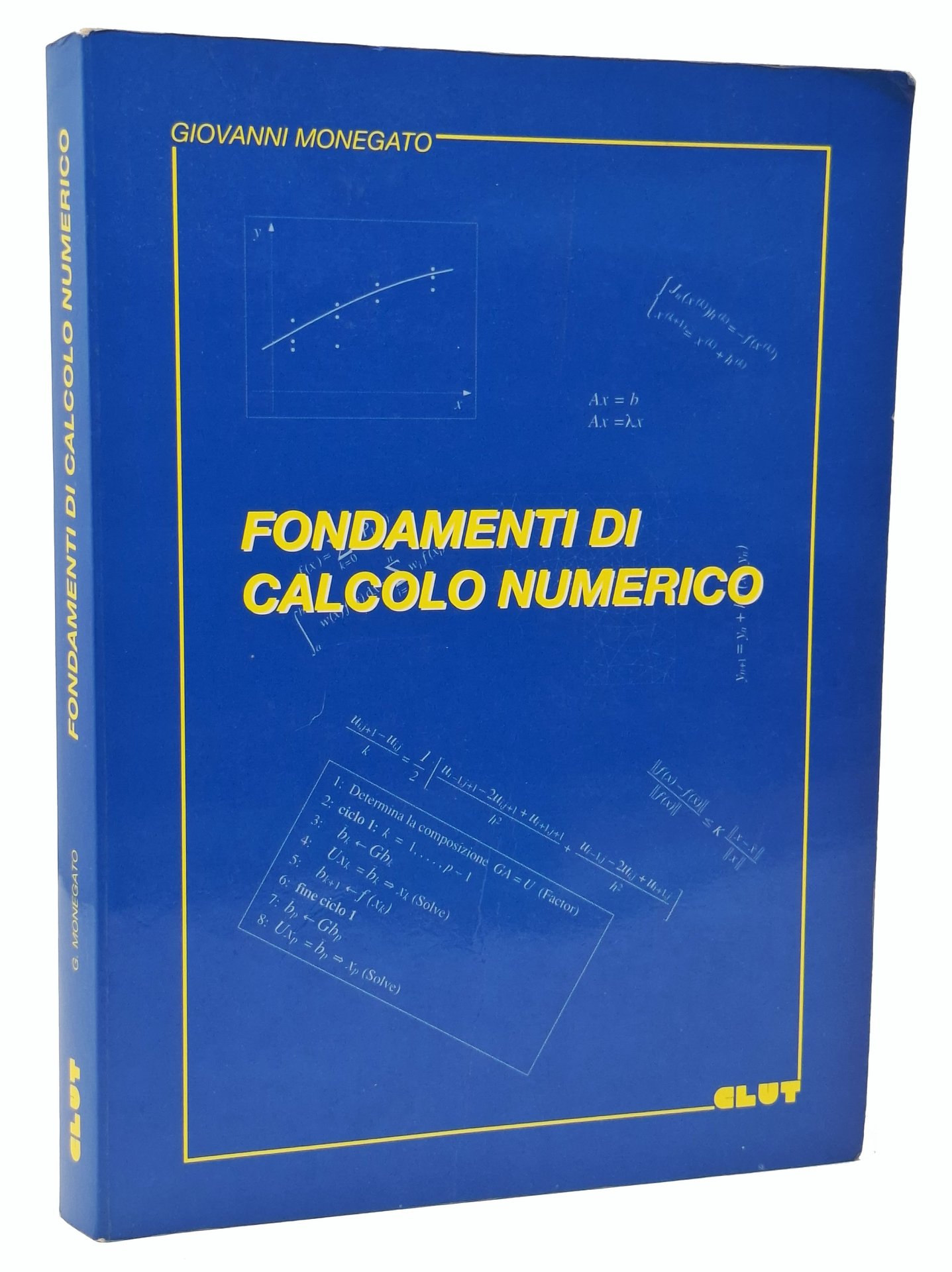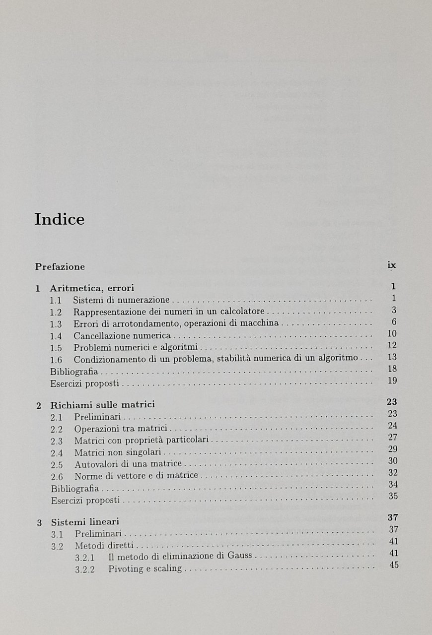 Pagine: XI + 389. Formato: 17 x 24 cm circa. Stato di conservazione: crocette a matita a fianco di alcuni capitoli nell'indice, due o tre annotazioni a matita nel testo, alcune indicazioni ('si', 'no') a matita a fianco di qualche paragrafo ma, nel complesso, comunque, un esemplare decisamente buono. Copertina editoriale flessibile. Indice dei grandi capitoli: 1- Aritmetica, errori; 2- Richiami sulle matrici; 3- Sistemi lineari; 4- Autovalori di matrici; 5- Approssimazione di dati e di funzioni; 6- Equazioni non lineari; 7- Calcolo di integrali; 8- Equazioni differenziali ordinarie; 9- Equazioni alle derivate parziali.