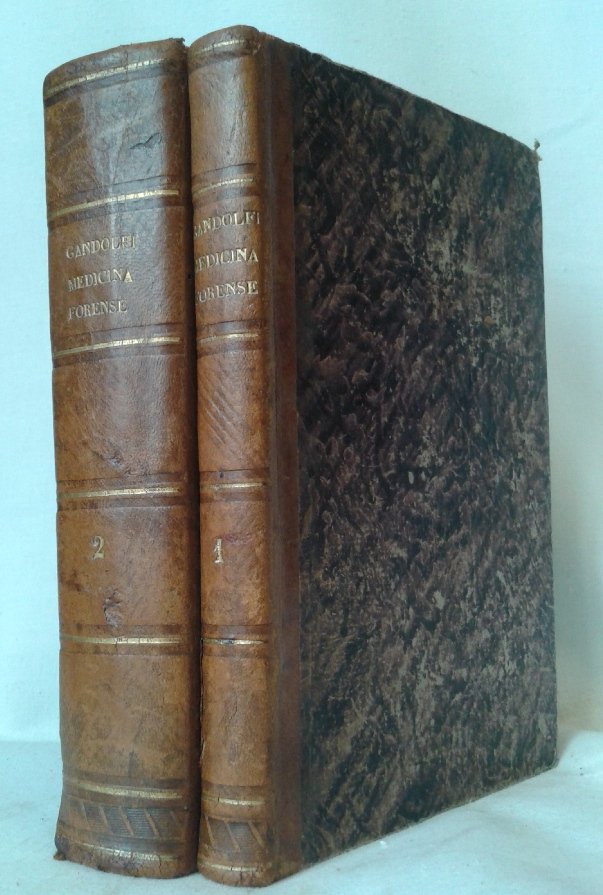 Tue volumi in 8, legati in mezza pelle (il terzo volume, dato in luce tre anni dopo il primo, in brossura editoriale mancante del piatto anteriore), titoli al dorso ornato da filetti in oro, sguardie, occhiello, frontespizi, dedicatoria dell'autore a Mittermajer, prefazione, 285, 829, 874 pp., annotazioni ed indici, 3 tavole f.t. di cui una ripiegata, con incisioni di strumenti. Il terzo ed ultimo volume, riveduto dallillustre Mittermaier, riguarda gli argomenti di medicina legale analitica speciale relativi alla sicurezza individuale. Molto interessante ed esaustiva opera, in prima edizione, uno dei trattati di medicina legale fra i pi diffusi in Europa, contenente una originale e molto interessante concezione della materia; Giovanni Gandolfi (1806-1875): insegnante a Modena per la facolt di medicina e di giurisprudenza dal 1851 e quindi a Pavia, dal 1863, si distinse nel dibattito medico-scientifico durante la terza e pi grave epidemia colerica del XIX secolo. Tranne che per le mende alla legatura del terzo volume, opera in pi che buono stato. Notevolmente importante. Rara prima edizione.