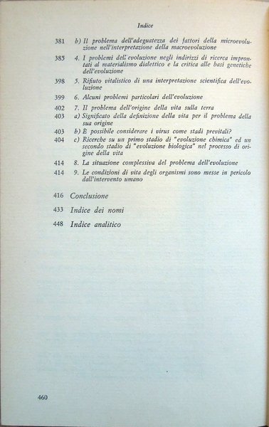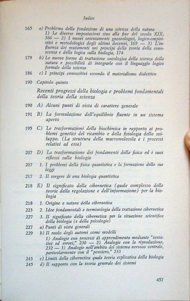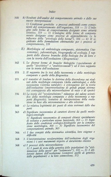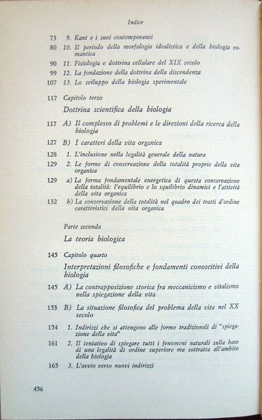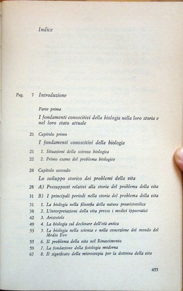 In-8° (21,8 x 13,9 cm) pp. 460, (4), legatura editoriale in tela. Conservata la sovraccoperta in acetato trasparente, che presenta due piccole mancanze, una nel bordo inferiore della parte che copre il dorso, una nell'angolo inferiore destro della parte che copre il piatto anteriore del volume, e alcuni strappi, sistemati con nastro adesivo opaco. Nel bordo esterno, bianco, del foglio con le pagine 123-124, lieve segno di piegatura longitudinale. Piccoli, leggeri segni d'umido al taglio di testa e, minimi e lievissimi, alle carte di guardia. Normale patina del tempo alle pagine, con leggere arrossature dovute al tipo di carta. Per il resto, ben conservato. Volume numero 12 nella collana "Filosofia della scienza" diretta da Ludovico Geymonat. Prima edizione italiana, 1972. Indice: Introduzione. Parte prima. I fondamenti conoscitivi della biologia nella storia e nel loro stato attuale. Capitolo primo. I fondamenti conoscitivi della biologia. Capitolo secondo. Lo sviluppo storico dei problemi della vita. Capitolo terzo. Dottrina scientifica della biologia. Parte seconda. La teoria biologica. Capitolo quarto. Interpretazioni filosofiche e fondamenti conoscitivi della biologia. Capitolo quinto. Recenti progressi della biologia e problemi fondamentali della teoria della scienza. Capitolo sesto. Effetti dei mutamenti della problematica biologica sulle singole discipline. A) Genetica (ricerca sull'eredità e la mutazione). B) Fisiologia del ricambio. C) Fisiologia dello sviluppo. D) Fisiologia generale, neurofisiologia, ricerca del comportamento. E) Morfologia ed embriologia comparate, sistematica (tassonomia), paleontologia, biogeografia ed ecologia. I rapporti delle diverse branche della biologia fra di loro e con la teoria dell'evoluzione (filogenetica). Conclusione. Indice dei nomi. Indice analitico.
