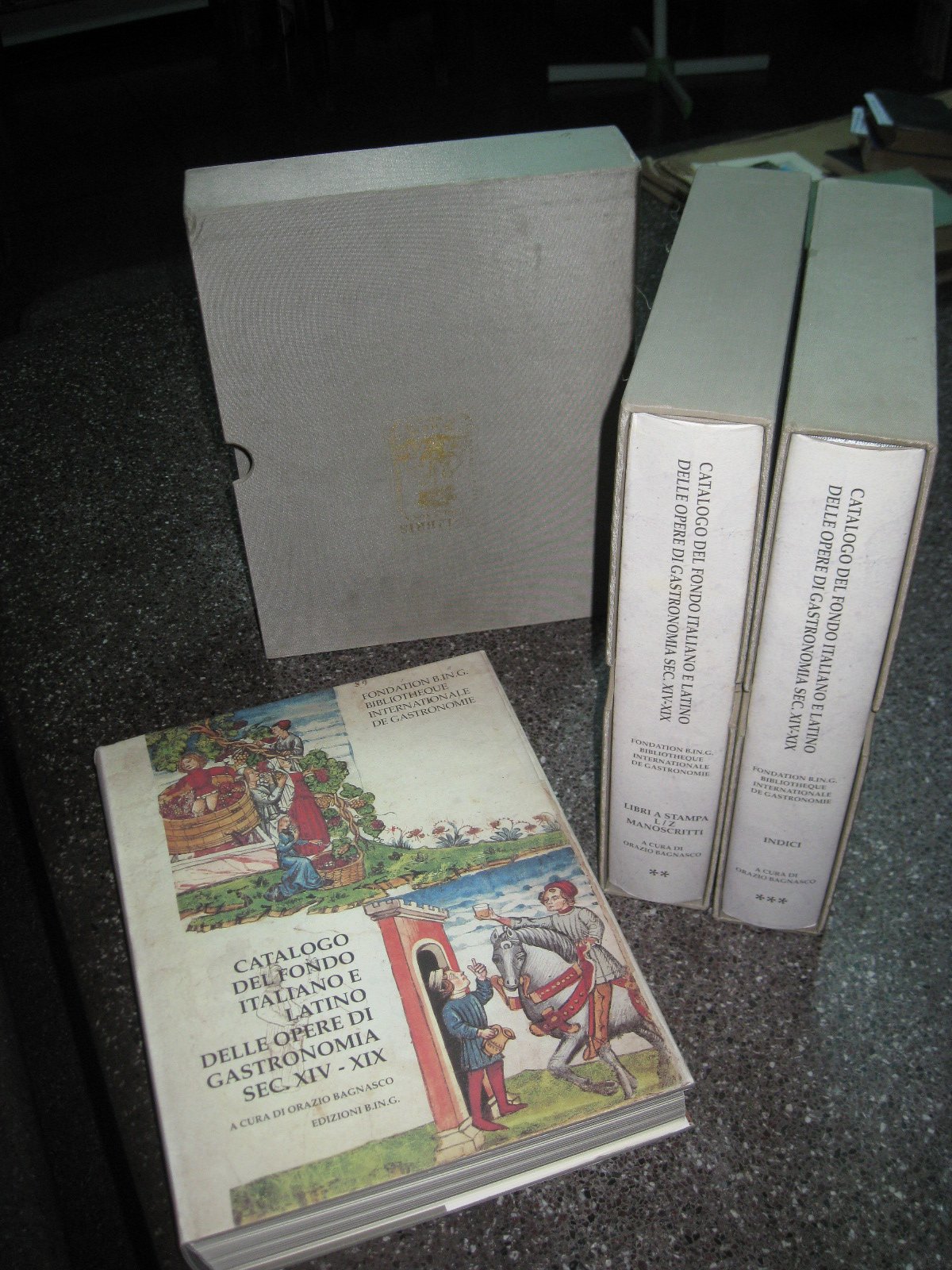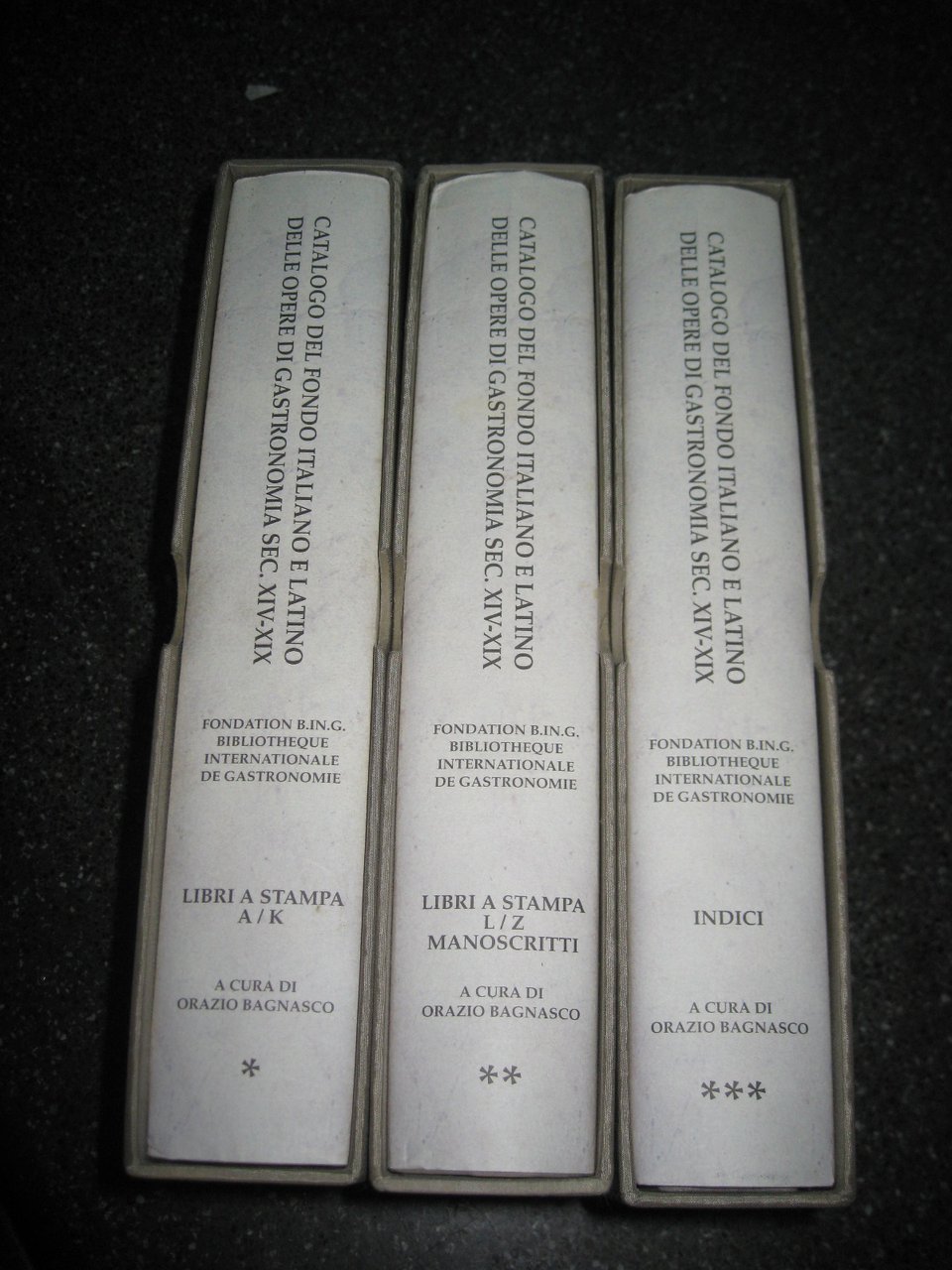 3 volumi in-4° (320x250mm), pp. 928; 1874; 988; legatura editoriale t. tela grigia con titolo in oro al piatto e al dorso e riproduzione dell'ex-libris della Fondation B.I.N.G. al piatto anteriore. Sovraccoperte figurate a colori riproducenti miniature adornanti antichi manoscritti di gastronomia e custodie in cartone rivestito in seta con l'emblema della Fondazione al centro dei piatti. Vol. I: Opere a stampa A-K. 32 tavv a colori f.t., numerosissime ill. b.n n. t. Vol. II: Opere a stampa L-Z. 32 tavv a colori f.t., numerosissime ill. b.n. n. t. Vol. III: Indici grafici. 2.150 schede catalografiche che descrivono le opere a stampa (2.073 schede) e i Manoscritti (77 schede) della sezione italiana e latina posseduta dalla B.I.N.G., fondazione creata dal Bagnasco, curatore dei volumi, e ubicata a Sorengo, nel Canton Ticino. Perfetto stato conservativo. Prima edizione di questo referenziale catalogo di gastronomia, realizzato con il contributo della Banca della Svizzera italiana; le schede si presentano corredate di collazioni e riproduzioni dei frontespizi. Introduzioni di Piero Innocenti e di Bruno Laurioux.