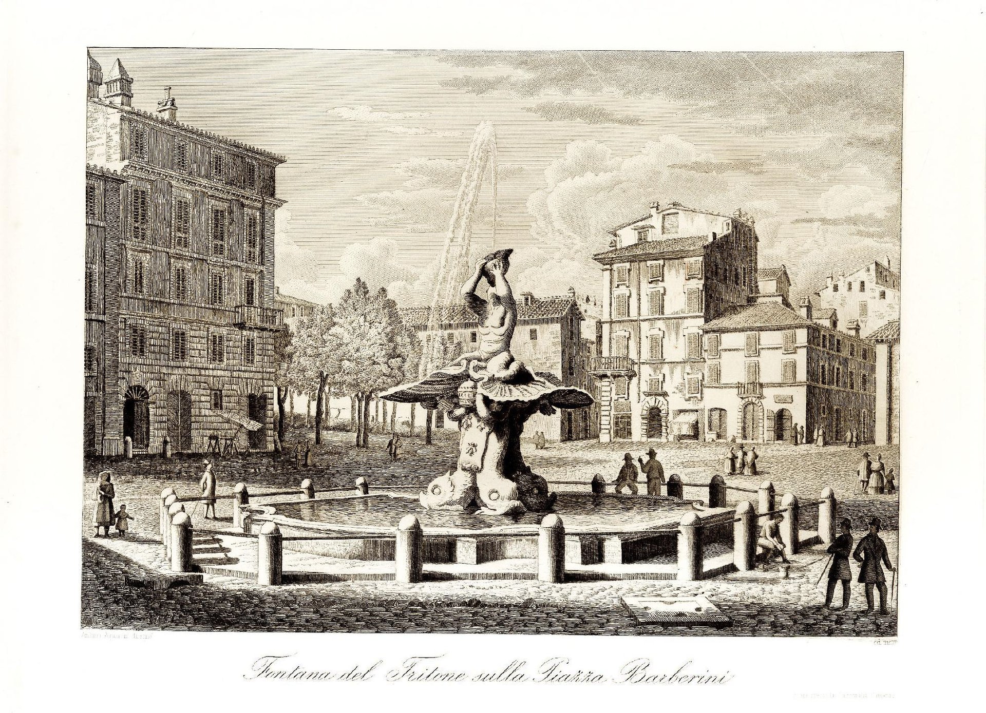 >incisione in rame,mm. 285x365 ed ampi margini. Titolo lungo il margine inferiore a destra il timbro a secco della calcografia. Tratta dalla serie monumentale di Fontane di Roma (iniziata nel 1837). Acquaroni Antonio (1801-1874) si diceva che vedesse la città "con le seste negli occhi"; e fu in realtà impeccabile quanto a fedeltà documentaria. Quando la Calcografia Camerale volle arricchire il suo fondo di vedute romane, lo chiamò a far parte dei suoi collaboratori ordinari (come risulta anche da un Elenco degli incisori, Roma, Arch. di Stato).