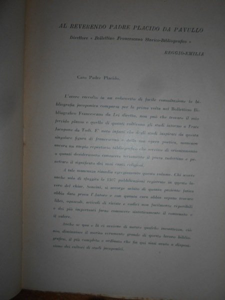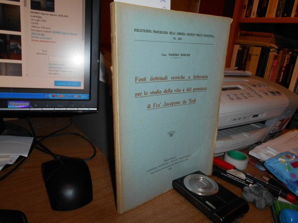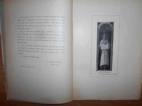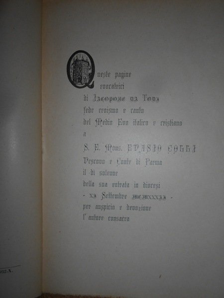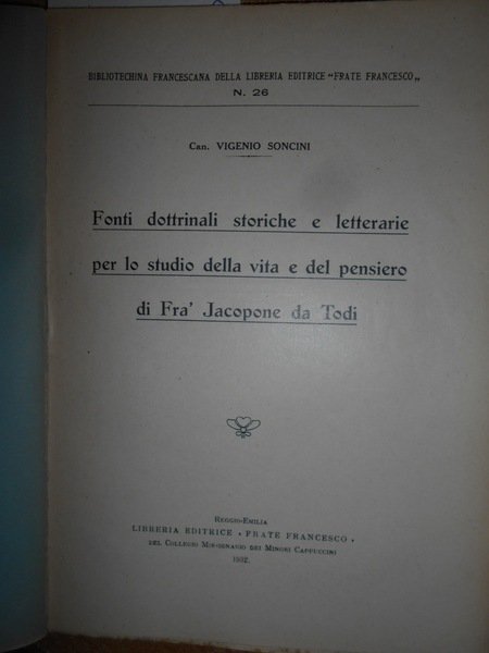 Vigenio, Soncini. Reggio-Emilia, Libreria Editrice << Frate Francesco>>, 1932. Fonti dottrinali storiche e letterarie per lo studio della vita e del pensiero di Fra' Jacopone da Todi. In-8°, br. orig. 124 pp. Ben conservato. Uff. A - II - 3 - 2