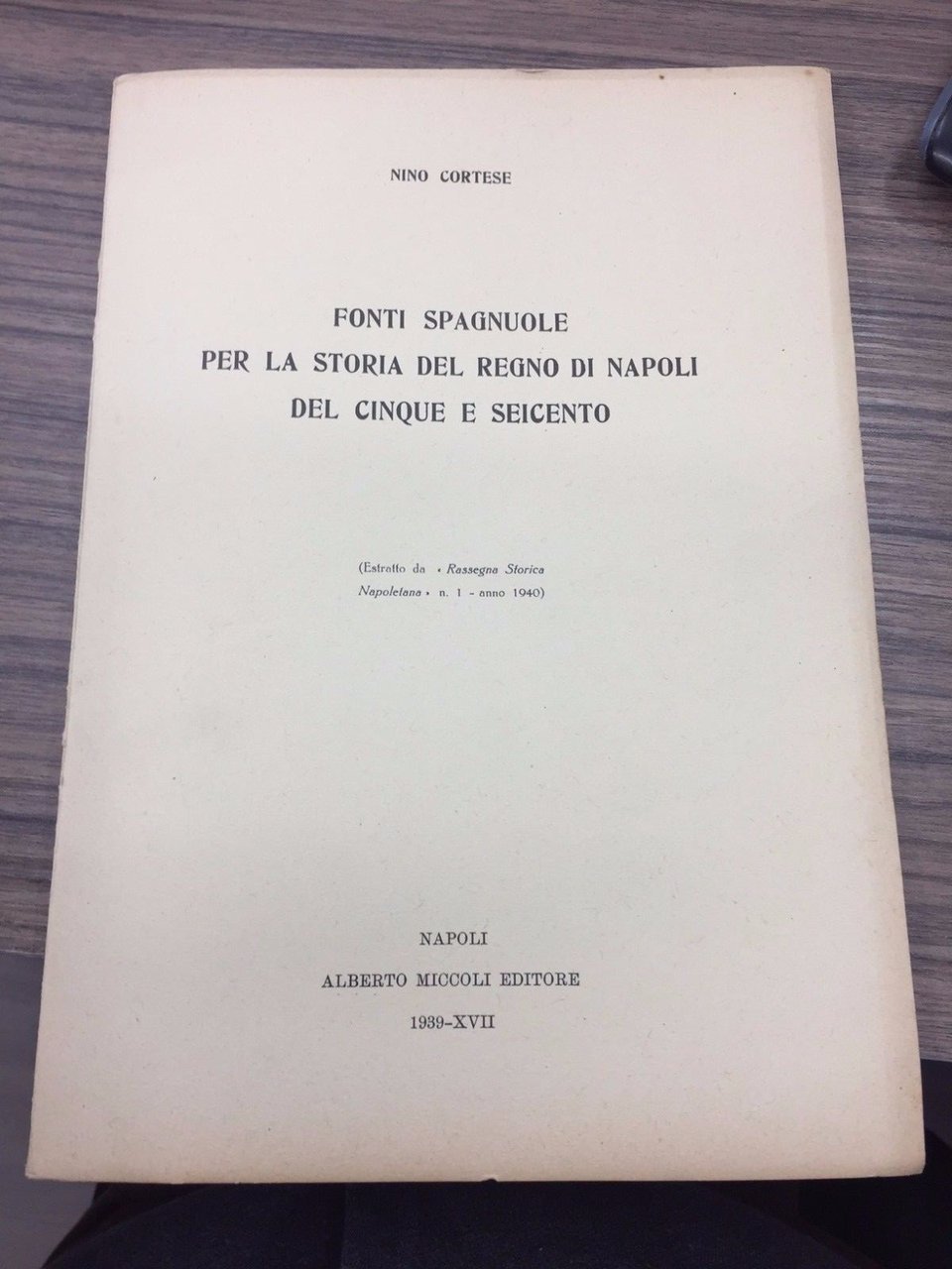 Estratto da "Rassegna Storica". Napoli. Miccoli 1939, 8°, pp. 36. Bross. Edit.