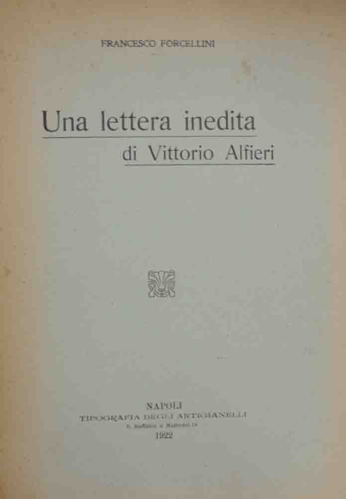 Francesco Forcellini, Una lettera inedita di Vittorio Alfieri, Tipografia degli Artigianelli, Napoli 1922, pp. 16, cm 28, br. ed. Tracce d’uso alla brossura, con dorso restaurato, qualche strappetto senza mancanze ai margini, minime fioriture e bruniture, ma interno ben conservato. Raro.