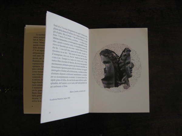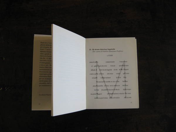 Napoli, Edizioni Morra, 2002. In -16, pp. 61, con 1 illustrazione a colori. Prefazione di Mario Lunetta. Intervento di poesia visiva "Di alcune laboriose bagattelle" (Tre carmi di Publilio Optaziano Porfirio). Prima edizione. Dedica firmata dall'autore alla p. 53.