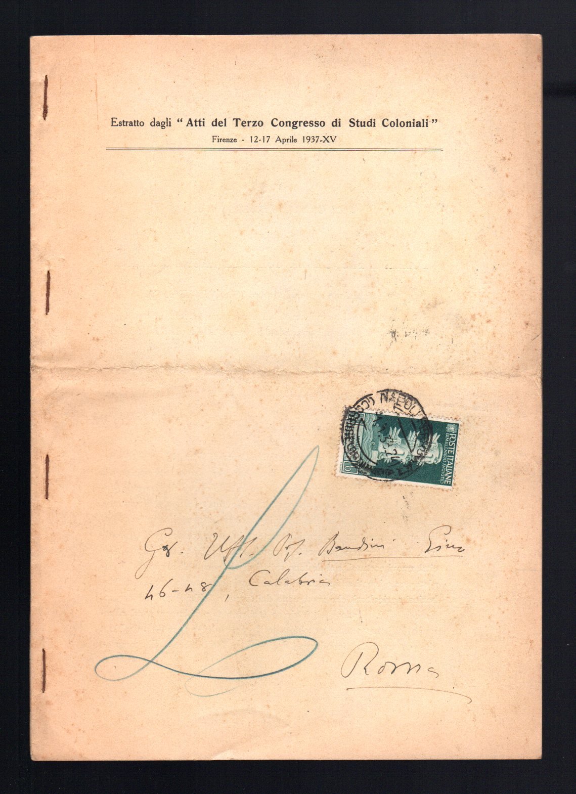 Opuscolo vintage. Estratto degli "Atti del Terzo Congresso di Studi Coloniali" Firenze, 12-17 Aprile 1937. Dedica autografa dell'autore. Indirizzo e francobollo in prima di copertina. Ordinario segno del tempo. Usura da scaffale.