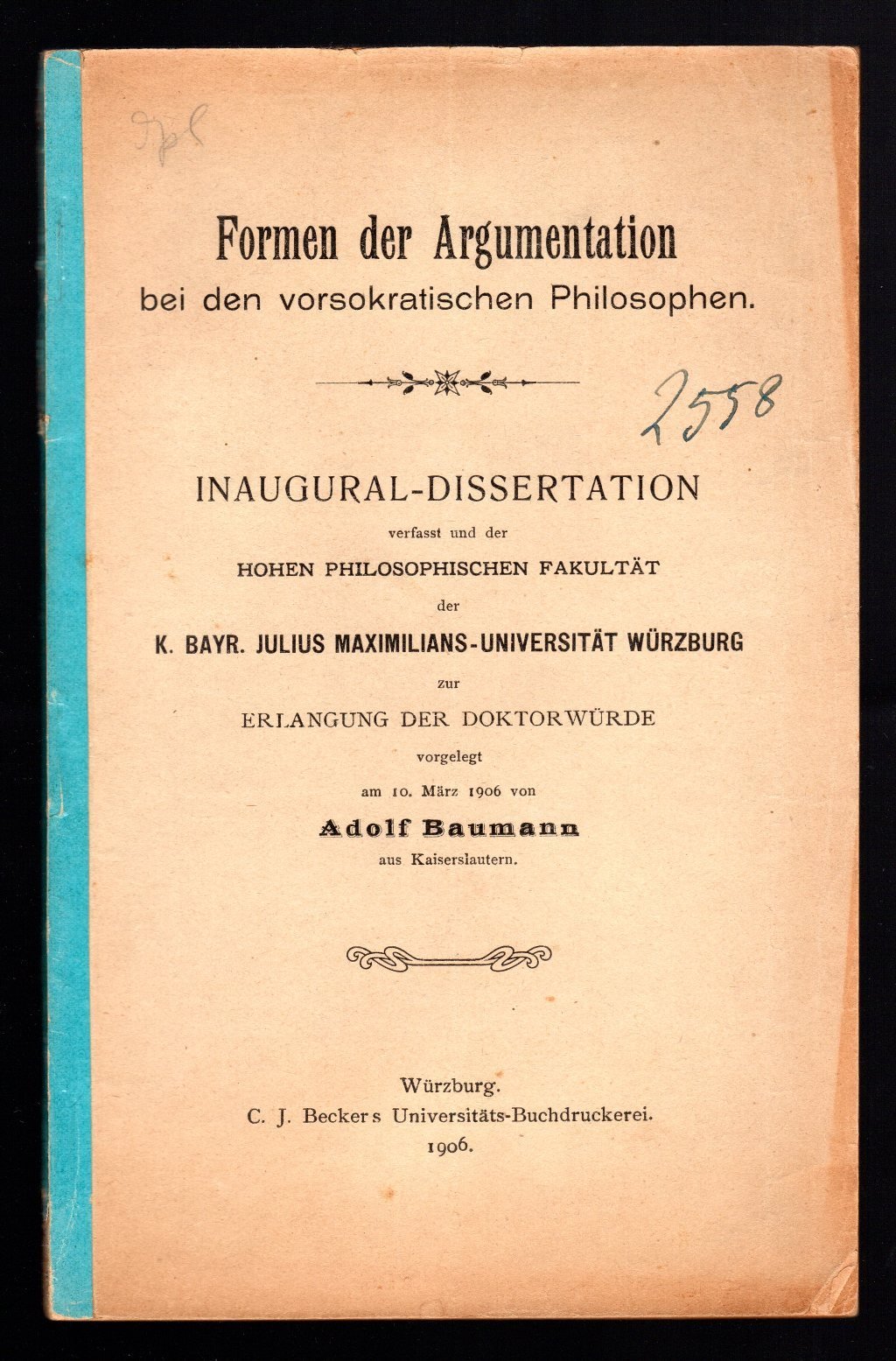 Opuscolo vintage in-8° con 88 pagg, Wurzburg, 1906. Saggi. Testo in lingua tedesca.