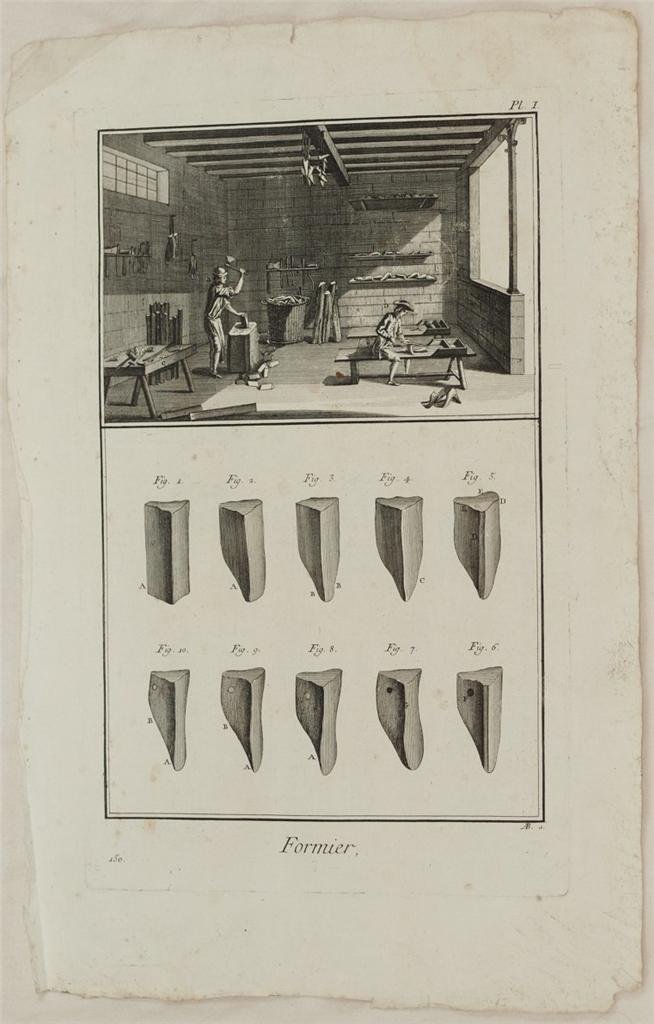 Bella incisione su rame di grandi dimensioni del 1785 tratta dall'opera "Recueil de planches de l'Encyclopedie - Paris, Panckoucke et Liege 1785". L'incisione rappresenta un laboratorio per intagliare forme di legno per cappellieri e sarte. TECNICA: Incisione su rame DIMENSIONI FOGLIO: cm 44x29 DIMENSIONI INCISIONE: cm 35x22,5 EPOCA: 1785 CONDIZIONI: Buone condizioni, qualche fioritura. Usure ai margini in barbe. Beautiful copper engraving of big size of 1785 taken from the work "Recueil de planches de l'Encyclopedie - Paris, Panckoucke et Liege 1785". The engraving represents a laboratory of people who cut the wood block for sewers and hat producers. TECHNIQUE: copper engraving PAGE SIZE: cm 44x29 PRINT'S SIZE: cm 35x22,5 PERIOD: 1785 CONDITION: good conditions. Foxings. Worn uncut edges.