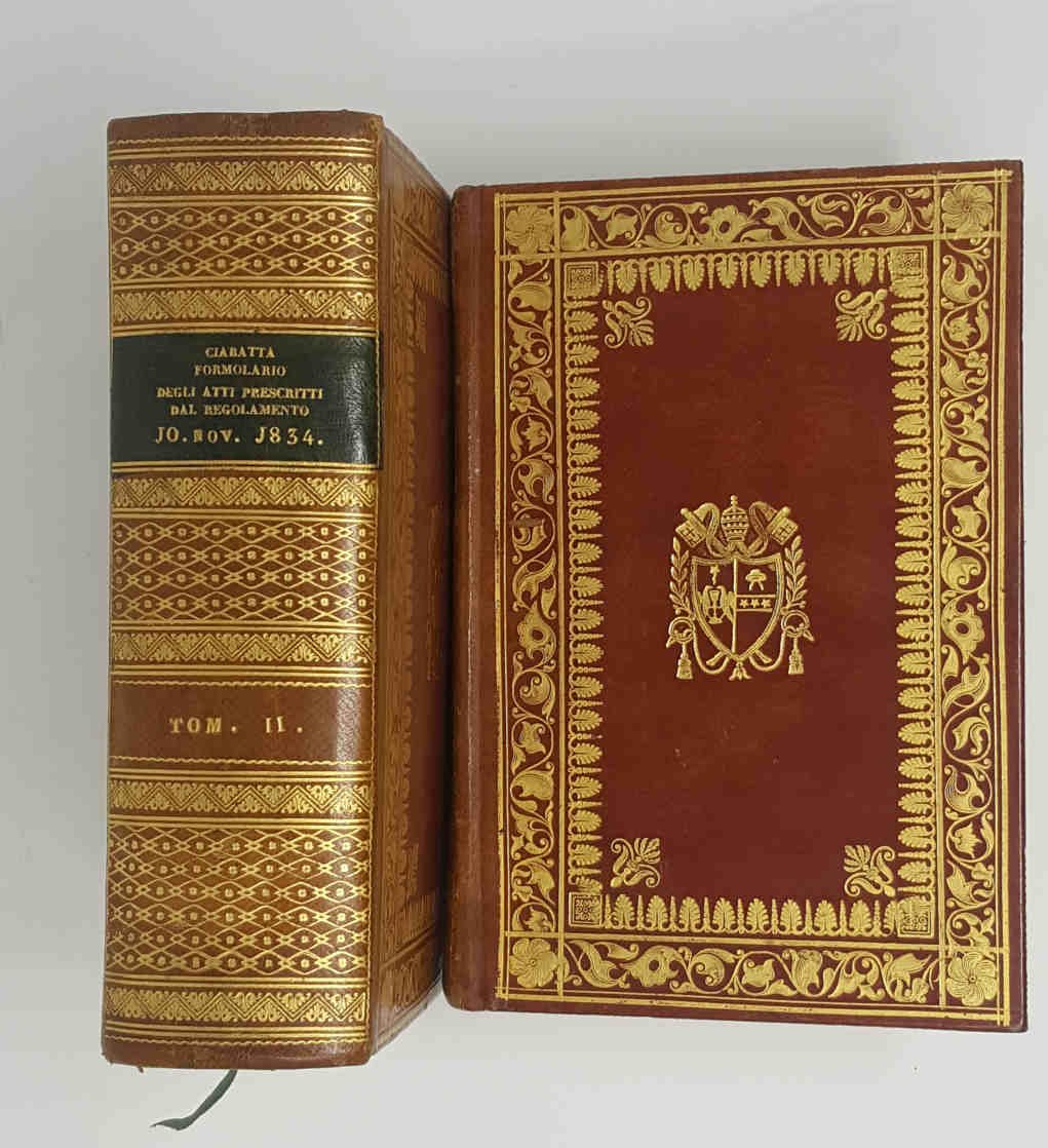 >2 volumi in-8 picc (mm.200x135)pp. XXV, 934; 1027, (1). Il formulario contiene centinaia di modelli per gli atti. Splendida legatura coeva in pieno vitello biondo, ricche decorazioni con motivi geometrici floreali e palmette, titoli su tasselli in marocchino verde ai dorsi. Piatti ornati da duplice cornice formata da motivi floreali e palmette, fleurons negli angoli interni, al centro dei piatti le armi Pontificie e armi di Gregorio XVI , tagli in oro zecchino. Esemplare di dedica impreziosito da bella legatura romana in vitello biondo alle armi di Papa Gregorio XVI (1831-1846), al secolo Bartolomeo Alberto Cappellari (Belluno, 18 settembre 1765 – Roma, 1º giugno 1846), 254º vescovo di Roma e papa della Chiesa cattolica dal 2 febbraio 1831 alla morte; della Congregazione Camaldolese dell'Ordine di San Benedetto. Esemplare ben conservato, nota ms. all'occhietto.