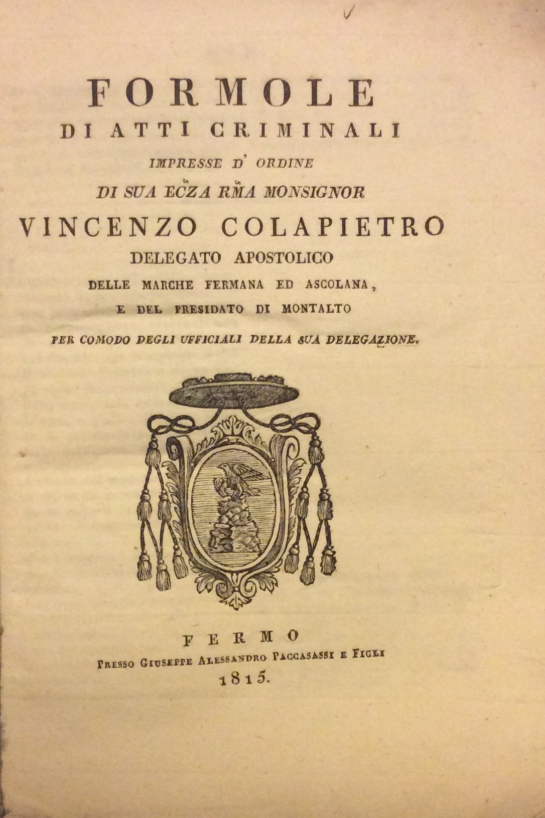 FORMOLE DI ATTI CRIMINALI IMPRESSE D'ORDINE DI SUA ECCELLENZA REV.MA MONSIGNOR VINCENZO COLAPIETRO. - Delegato Apostolico delle Marche Fermana ed Ascolana, e del Presidato di Montalto.